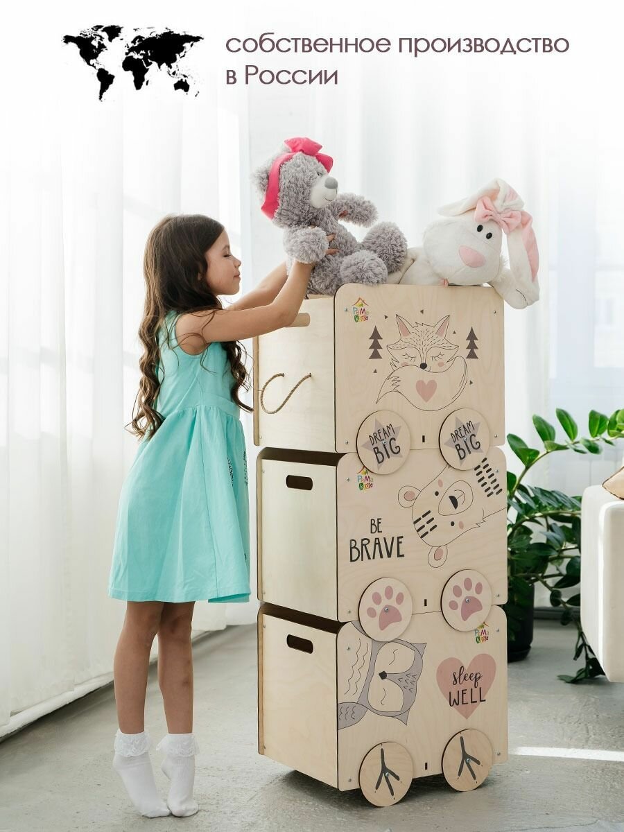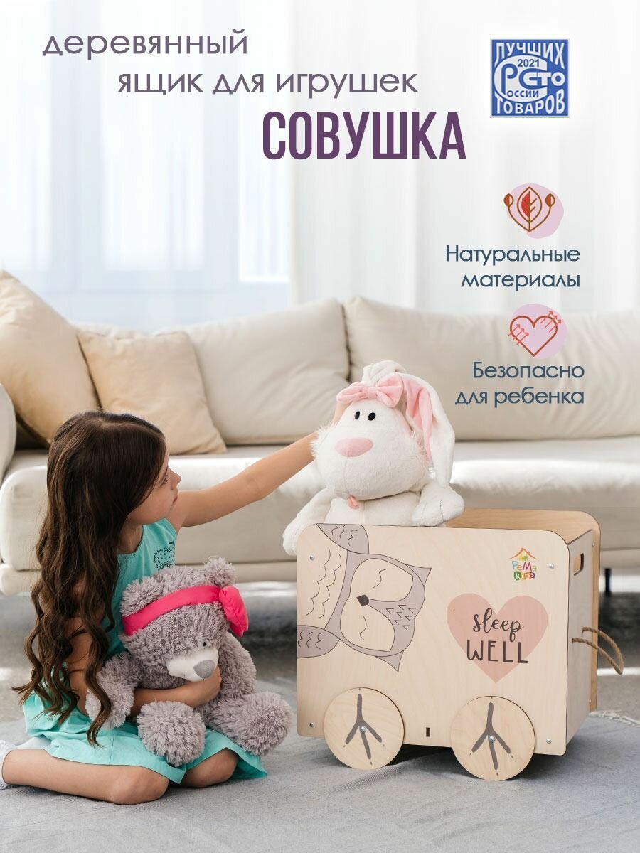 Ящик для хранения игрушек деревянный на колесах Совушка интересное: