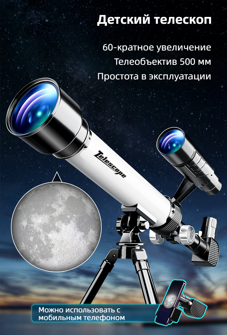 Астрономический телескоп XUEYOUMA для детей, 60x, 500 мм, базовая версия, черный/белый