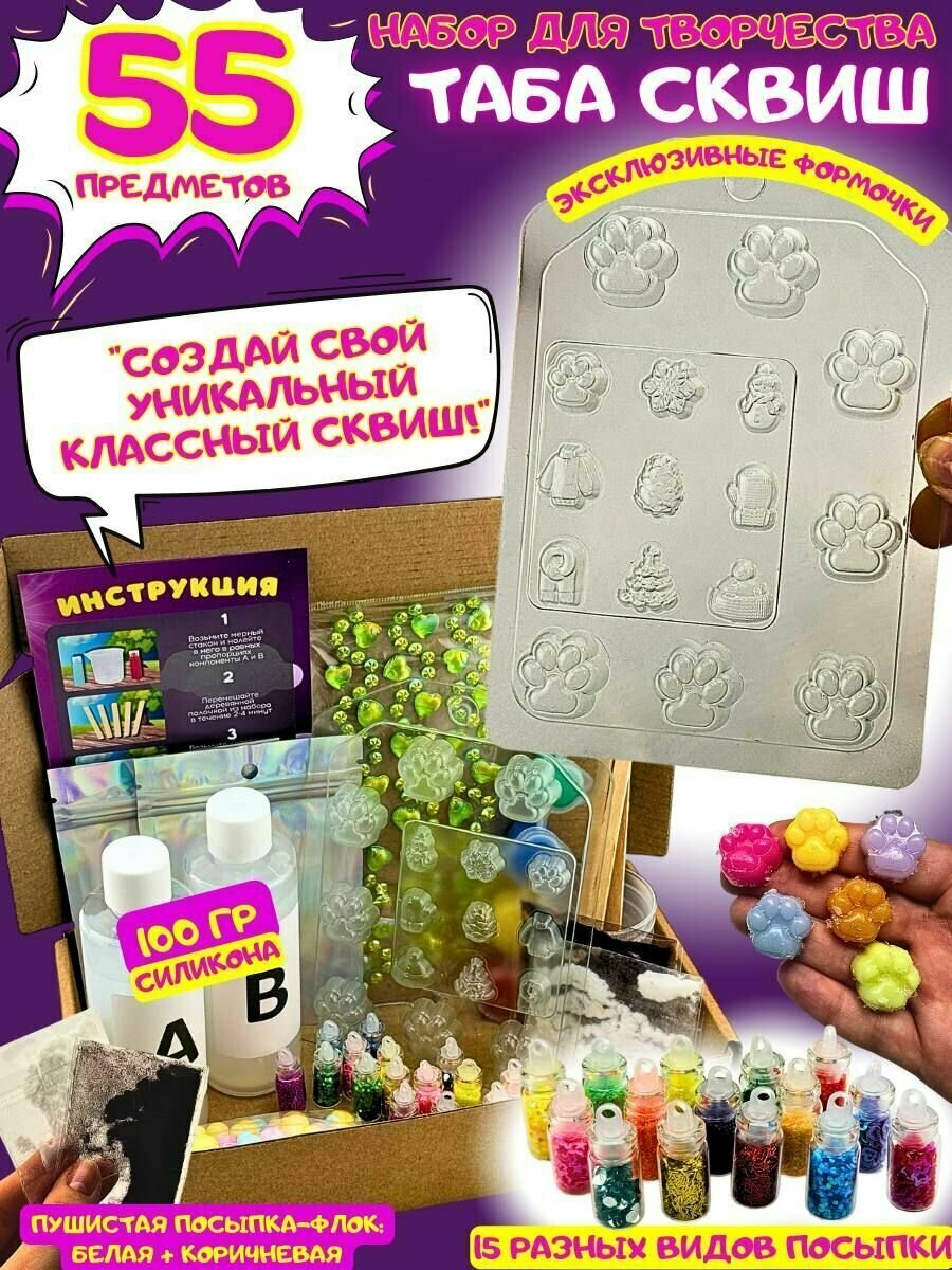 Игрушка антистресс для рук Таба Сквиш Кошачья лапка котика для детей/ Набор для создания Сквишей 55 предметов интересное: