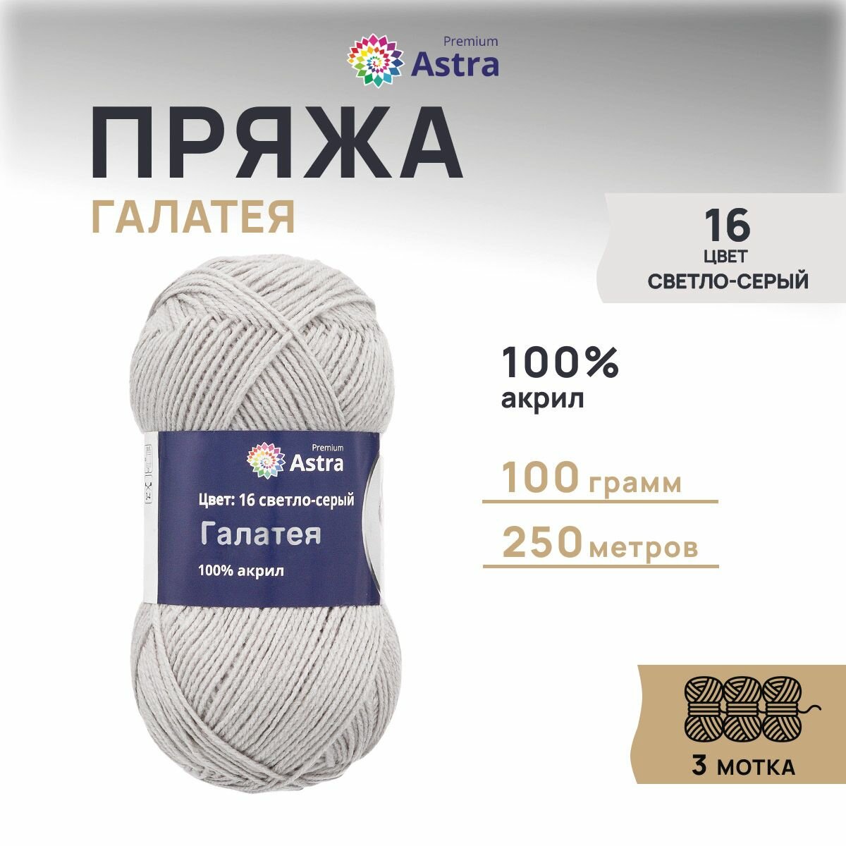 Купить Пряжа для вязания Astra Premium 'Галатея' 100г, 250м (100% акрил) (16 светло-серый), 3 мотка