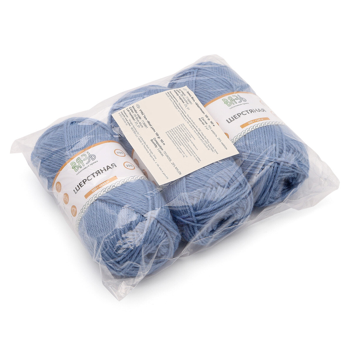 Пряжа для вязания Вязь 'Шерстяная' 100г, 165м (75% шерсть, 25% нейлон) (10 светло-голубой), 3 мотка