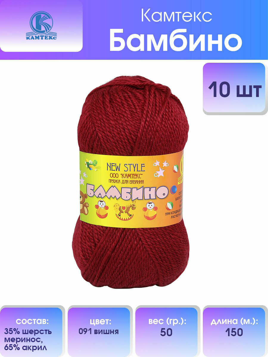 Купить Пряжа для вязания Камтекс 'Бамбино' 50г, 150м (35% шерсть меринос, 65% акрил) (091 вишня), 10 мотков