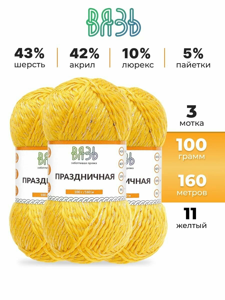 Купить Пряжа для вязания Вязь 'Праздничная' 100г, 160м (43% шерсть, 42% акрил, 10% люрекс, 5% пайетки) (11 желтый), 3 мотка