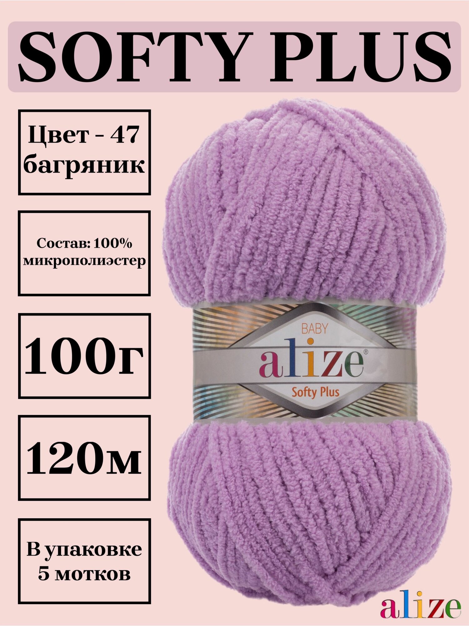 Пряжа ALIZE "Softy Plus", 100 г, 120 м, 100% микрополиэстер, цвет 47 Сирень, 5 мотков