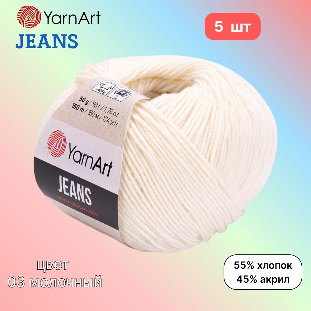 Купить Пряжа YarnArt Jeans, цвет молочный 03, 5 мотков, 50г/160м, состав 45% акрил, 55% хлопок, ярнарт джинс