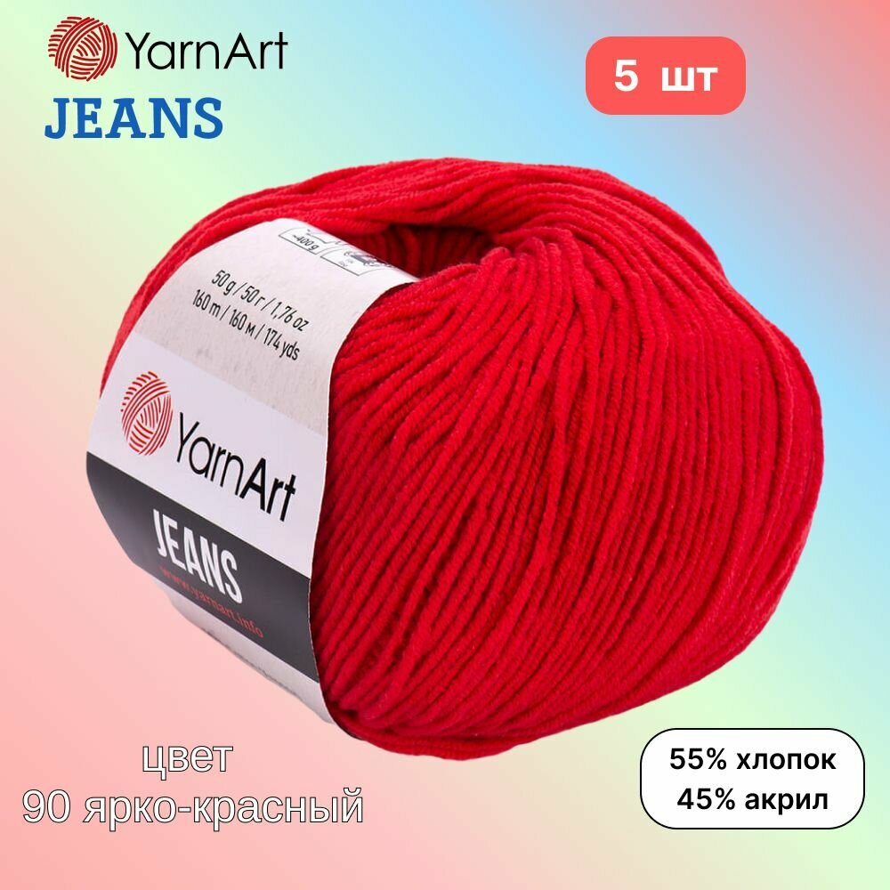 Купить Пряжа YarnArt Jeans, цвет ярко-красный 90, 5 мотков, 50г/160м, состав 45% акрил, 55% хлопок, ярнарт джинс