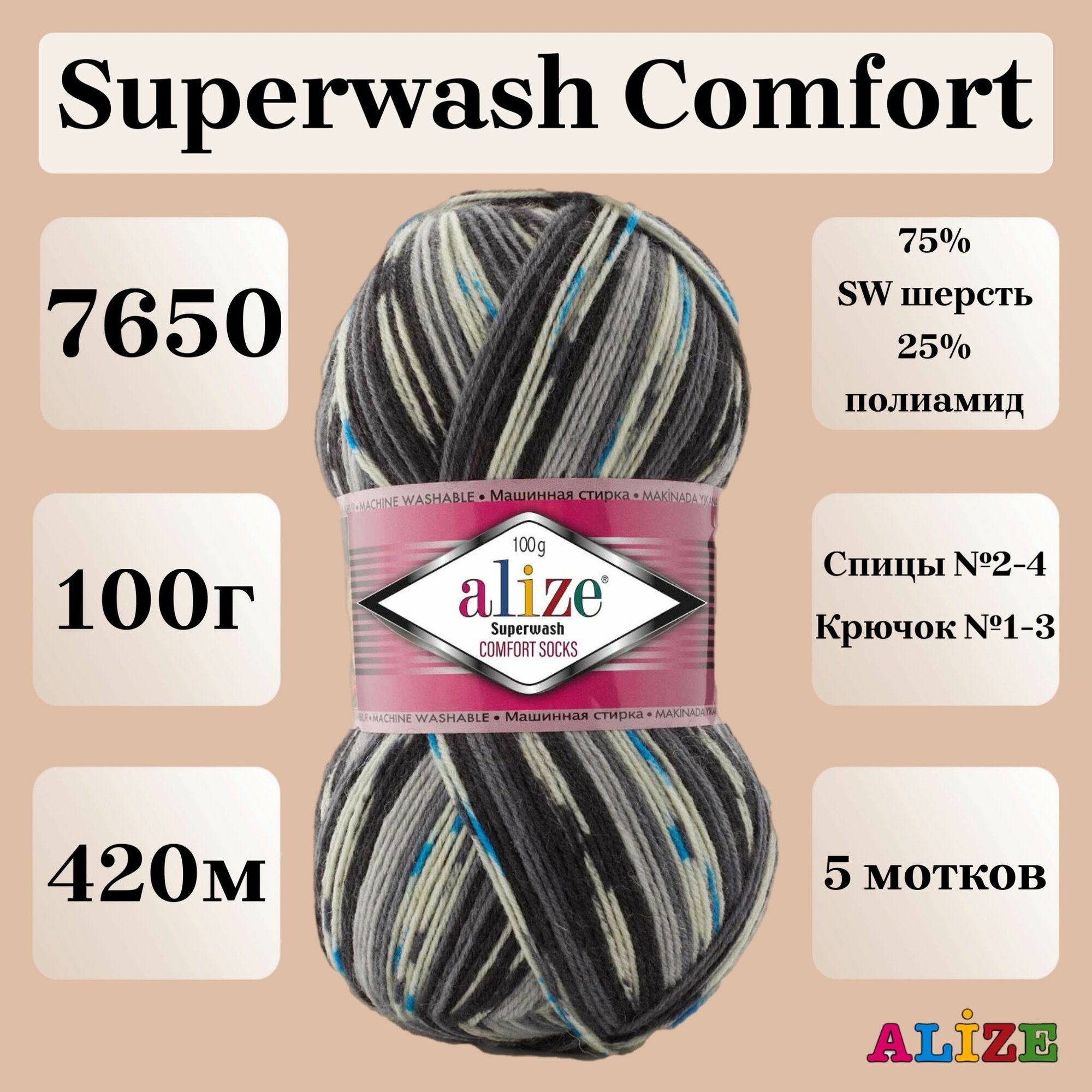 Купить Пряжа для вязания Alize Superwash Comfort Socks, цвет 7650, 100г, 420м, 5шт/упак