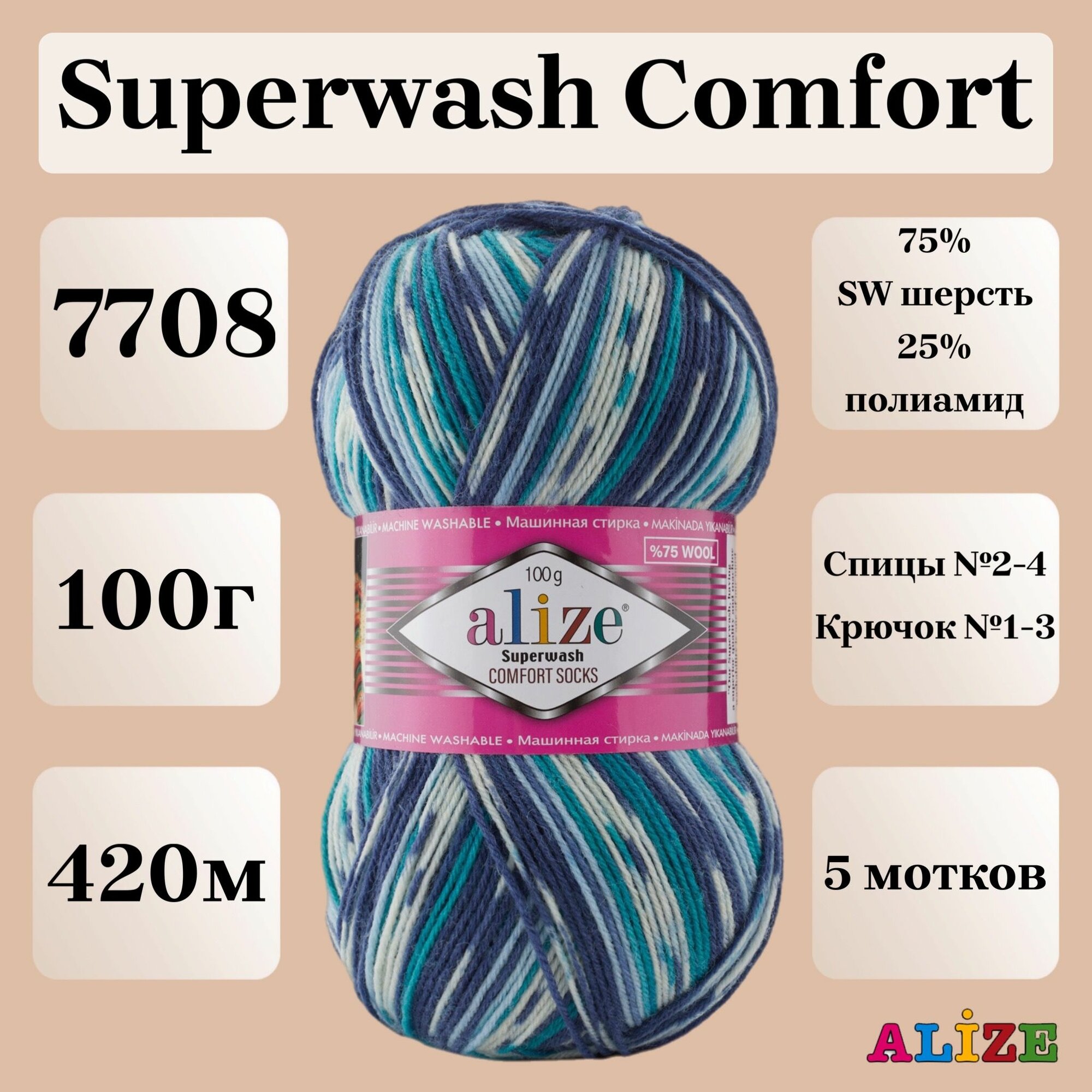 Пряжа для вязания Alize Superwash Comfort Socks, цвет 7841, 100г, 420м, 5шт/упак