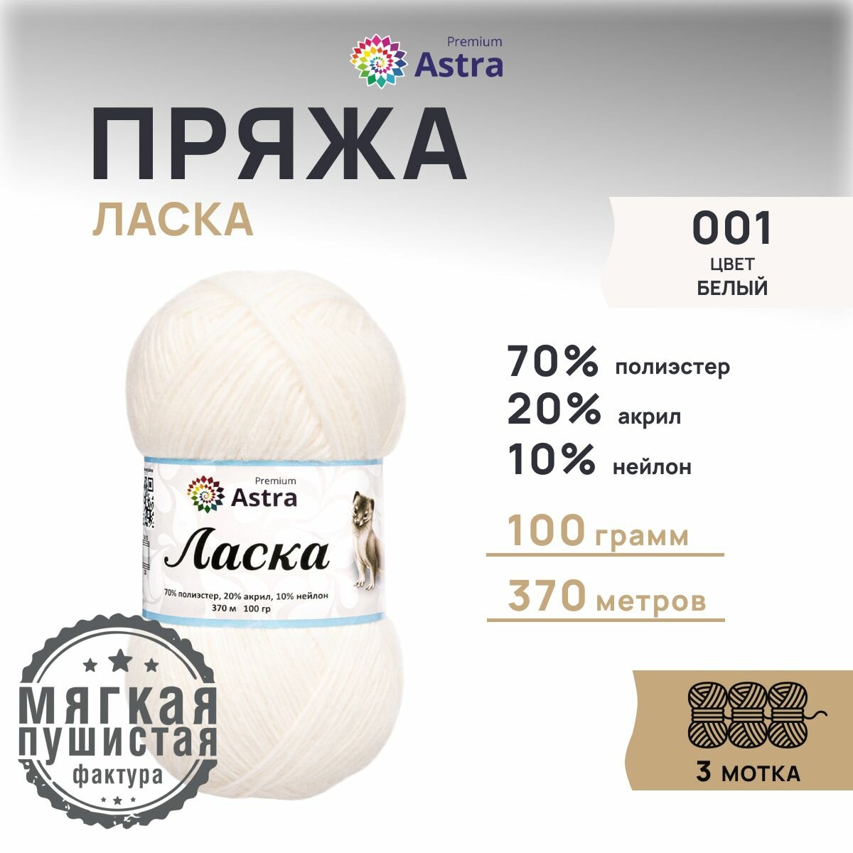 Купить Пряжа для вязания Astra Premium 'Ласка' 100г, 370м (70% полиэстер, 20% акрил, 10% нейлон) (001 белый), 3 мотка