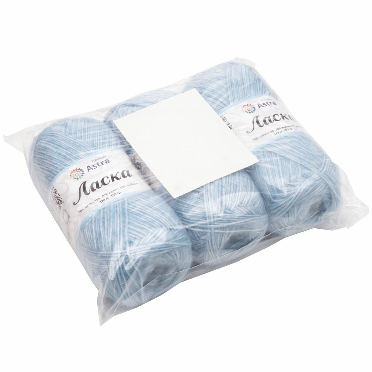 СохранитьПряжа для вязания Astra Premium 'Ласка' 100г, 370м (70% полиэстер, 20% акрил, 10% нейлон) (510 светло-голубой), 3 мотка интересное: