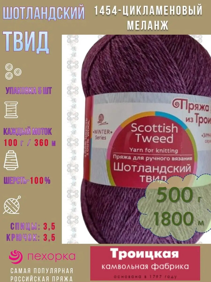 Пряжа Троицкая Шотландский твид 1454 цикламеновый меланж (100г/360м, упаковка 5 мотков)