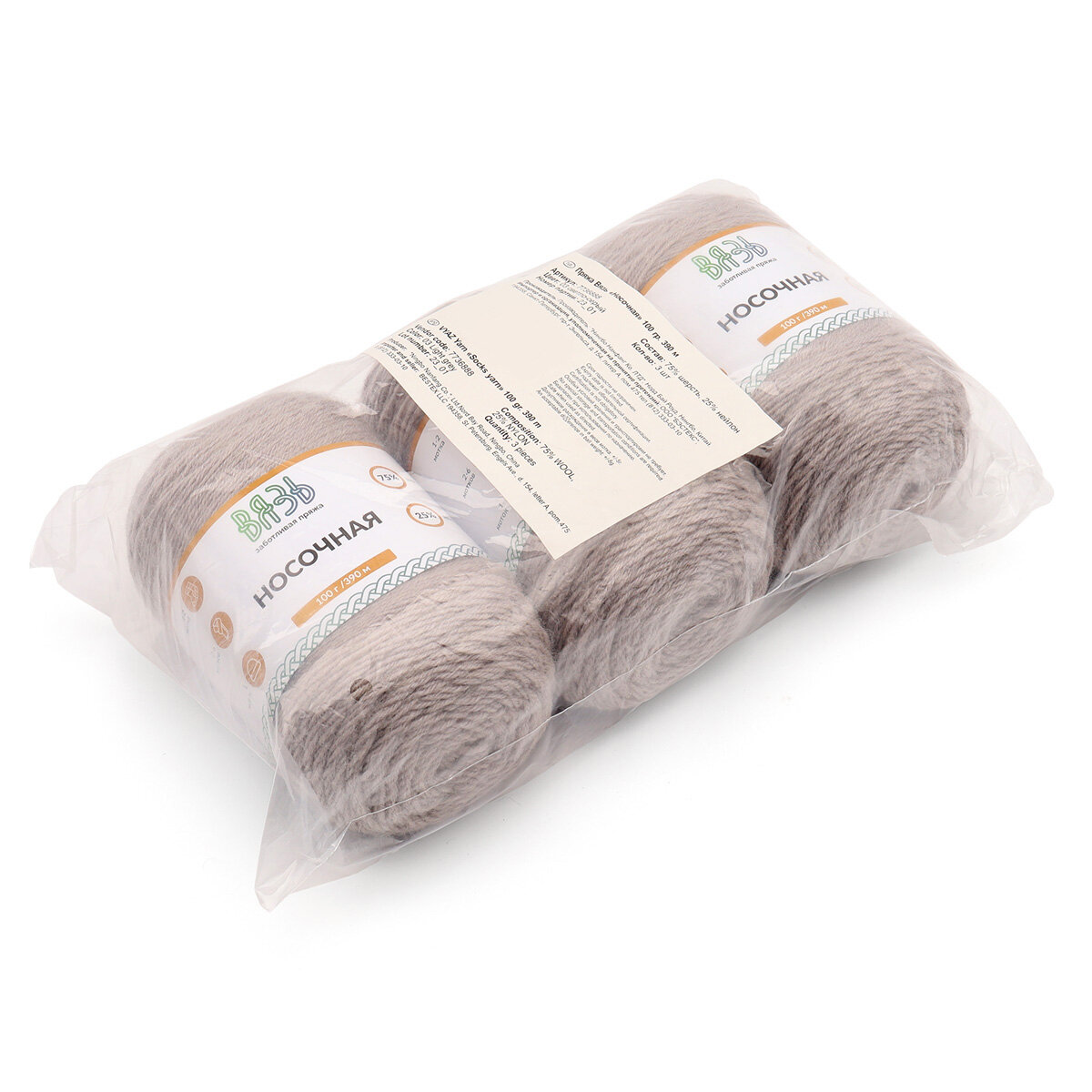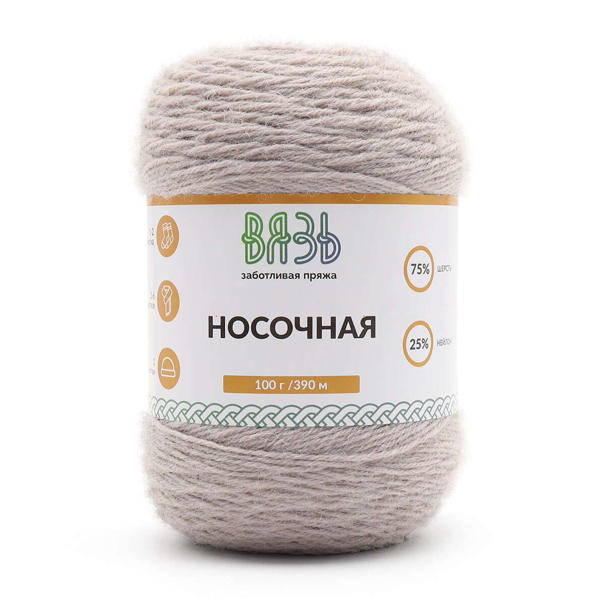 Пряжа для вязания Вязь 'Носочная' 100г, 390м (75% шерсть, 25% нейлон) (02 бежевый), 3 мотка