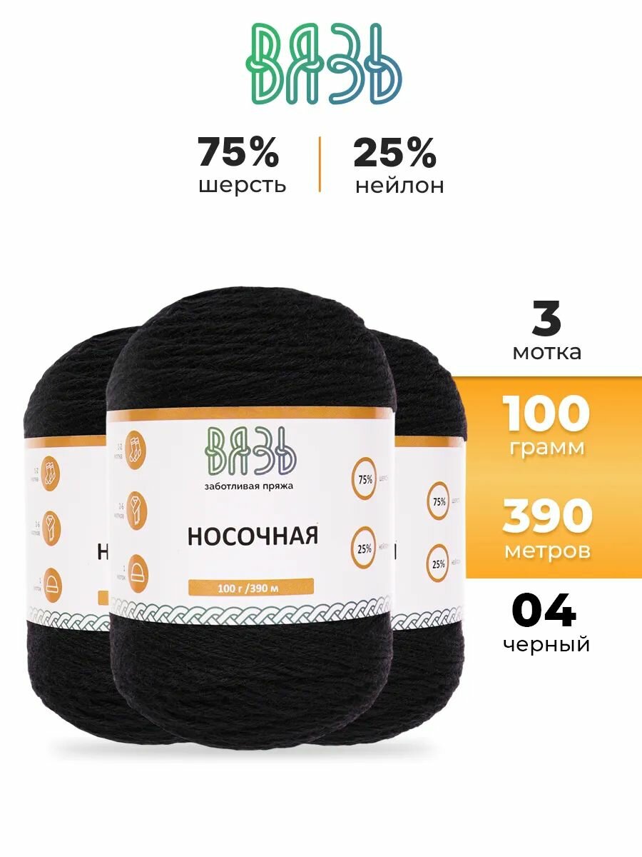 Купить Пряжа для вязания Вязь 'Носочная' 100г, 390м (75% шерсть, 25% нейлон) (04 черный), 3 мотка