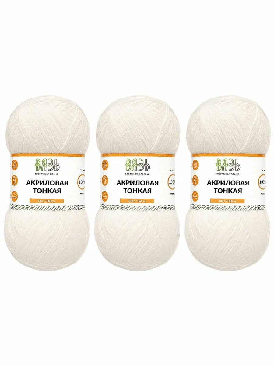 Купить Пряжа для вязания Вязь 'Акриловая тонкая' 100г, 360м (100% акрил) (001 белый), 3 мотка