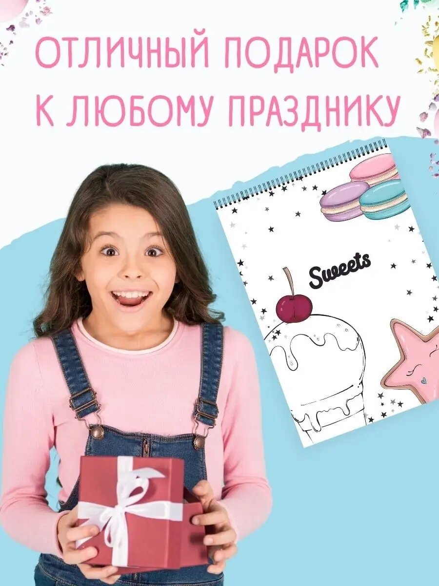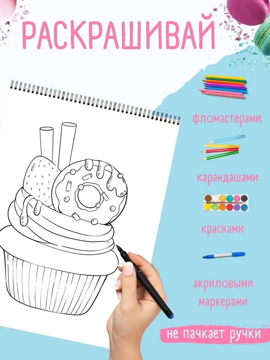Купить Скетч раскраска блокнот "Сладости и пирожные", формат А5, для маркеров и карандашей, подложка в комплекте