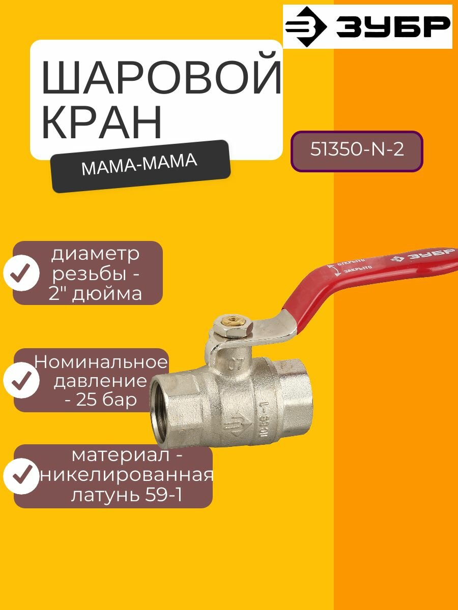 Кран ЗУБР 51350-N-2 шаровой 2" полнопроходной "мама-мама", ручка, никелированная латунь