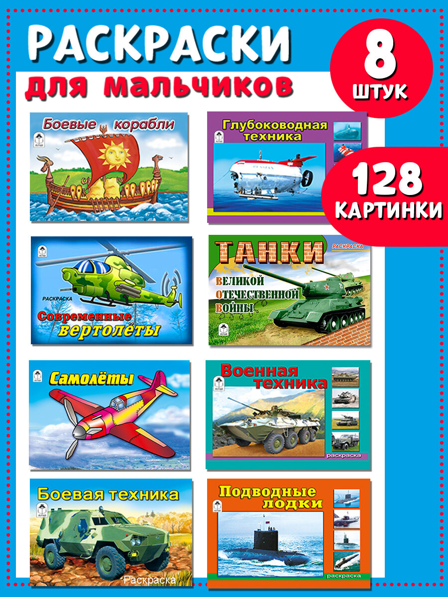 Комплект раскрасок Алтей и Ко "Машинки, поезда, танки, корабли", для мальчиков, 8шт