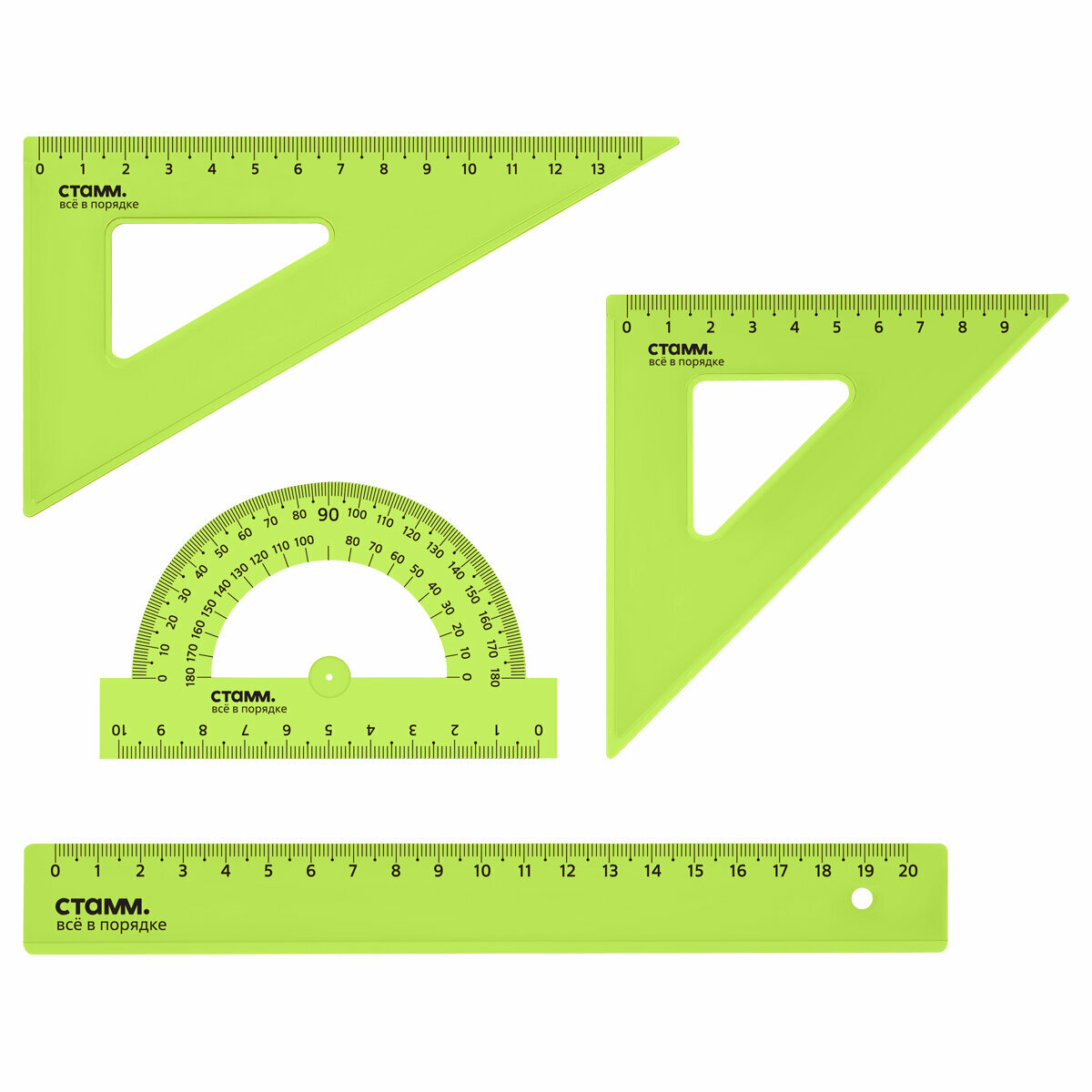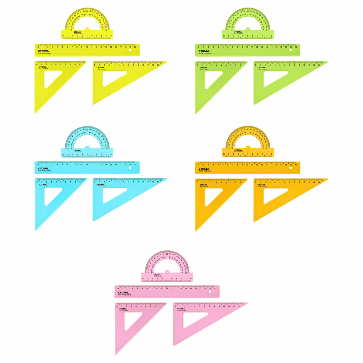 Купить Набор чертежный СТАММ, размер M (линейка 20см, 2 треугольника, транспортир), прозрачный, неоновые цвета, ассорти, европодвес