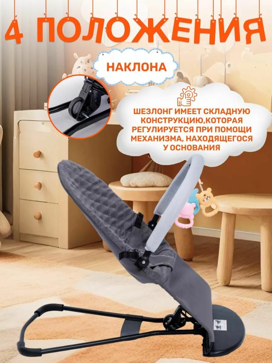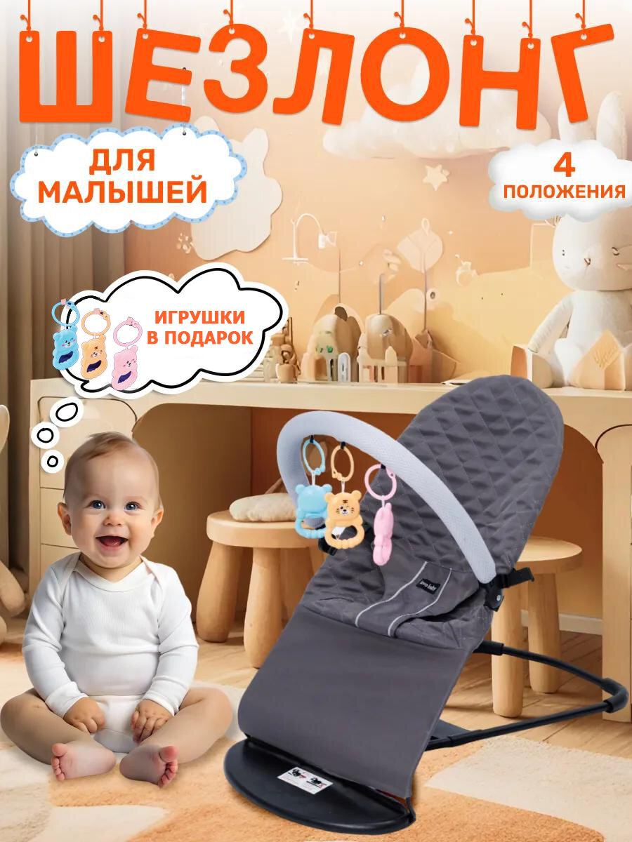 Шезлонг для новорожденных от 0, кресло шезлонг детское с подвесными игрушками, серый интересное: