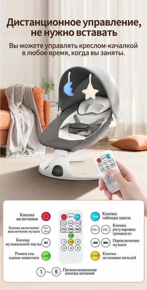Электрокачели, для новорожденных, управление через пульт, 5 режимов укачивания