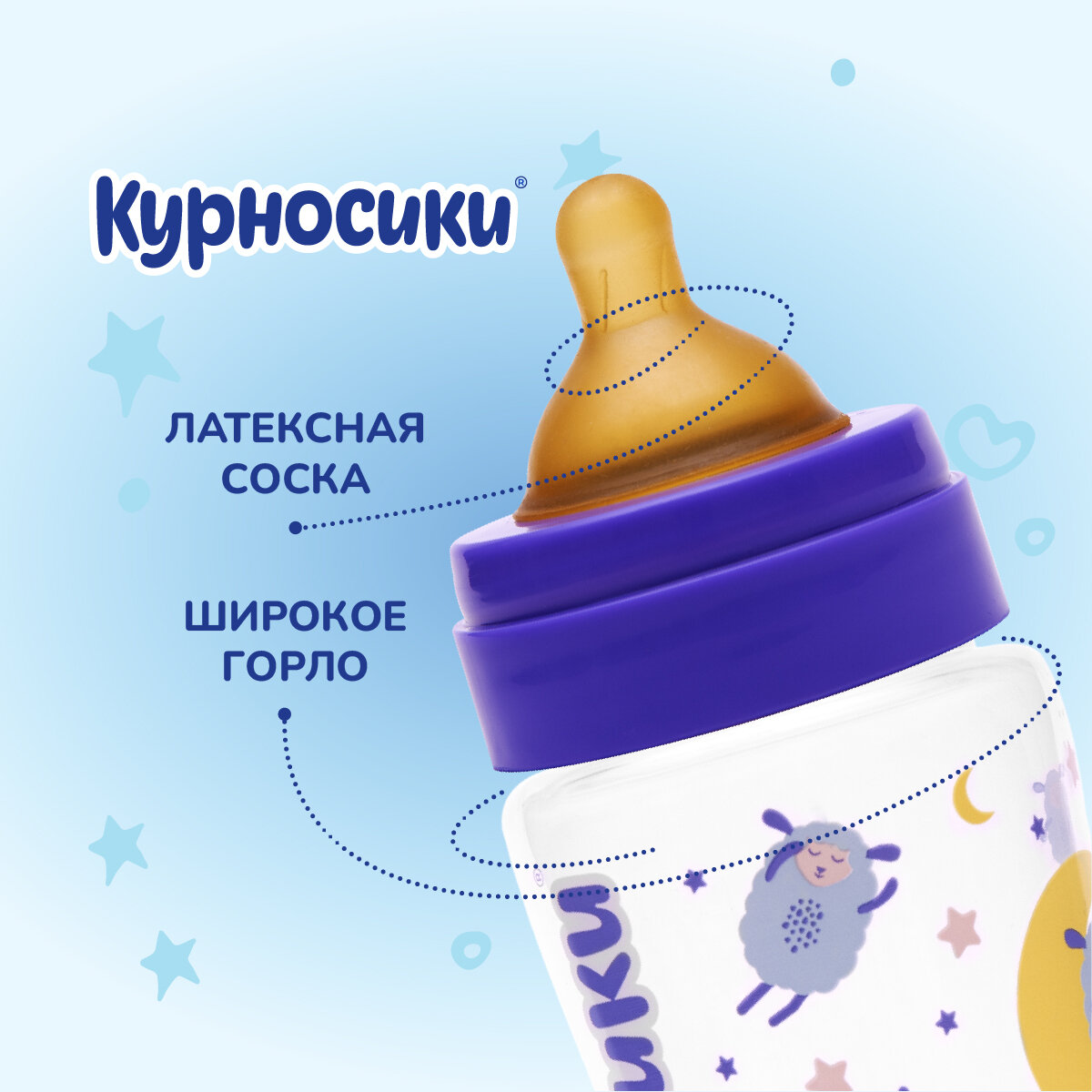Бутылочка для кормления новорожденных Курносики с широким горлом и латексной соской молочной, 250 мл. интересное: