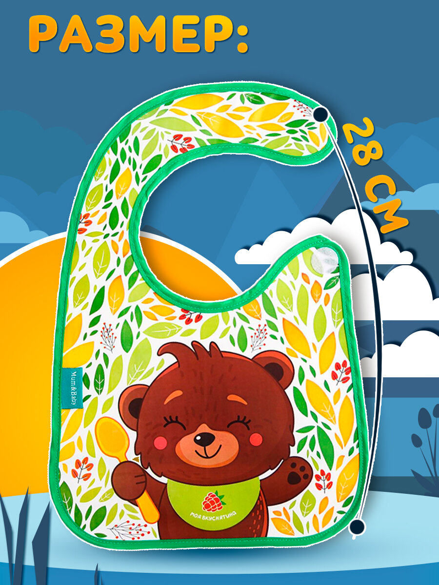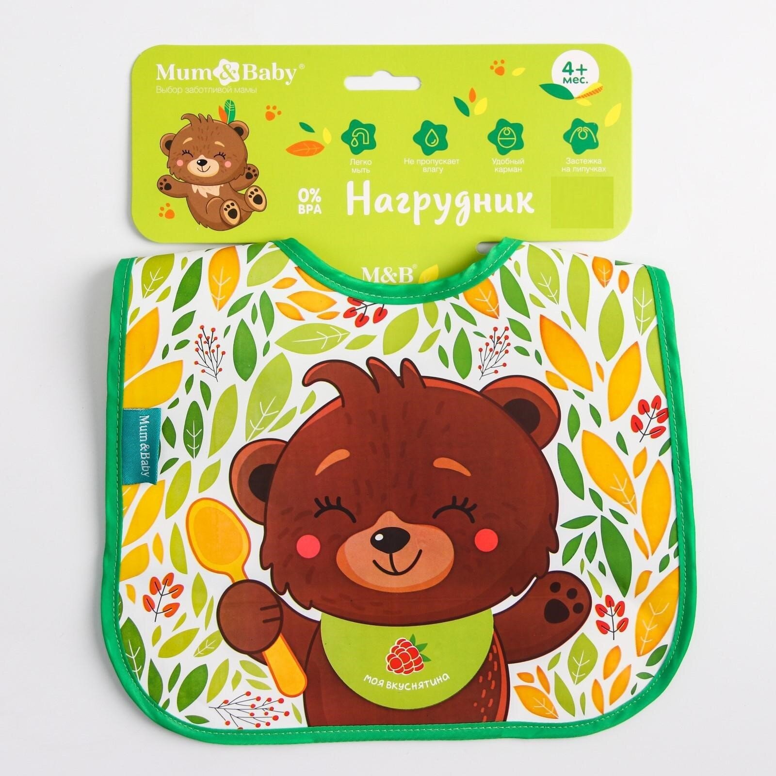 Нагрудник для кормления M&B «Мишка» непромокаемый на липучке, с карманом интересное: