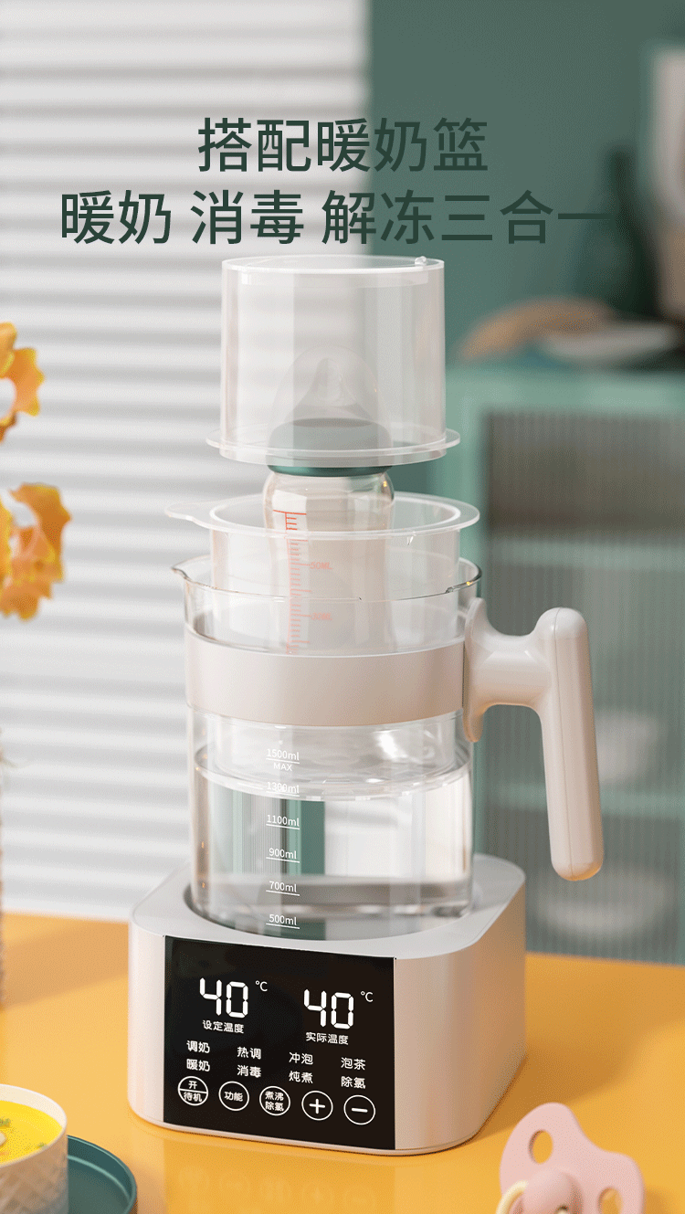 Детский чайник с постоянной температурой 1.5л, молочно-белый, большой экран, нагревательный элемент 316L + корзина для подогрева молока