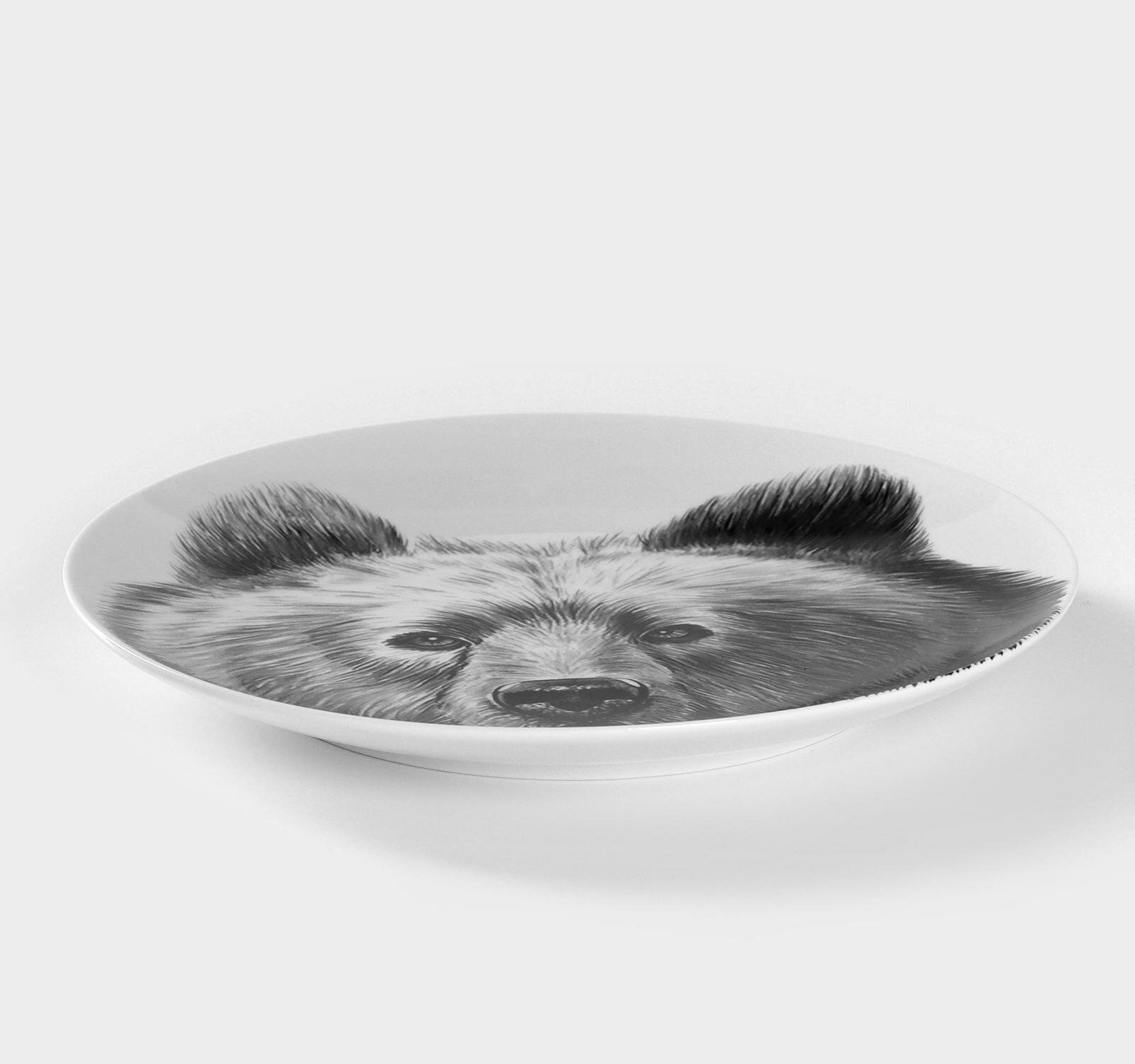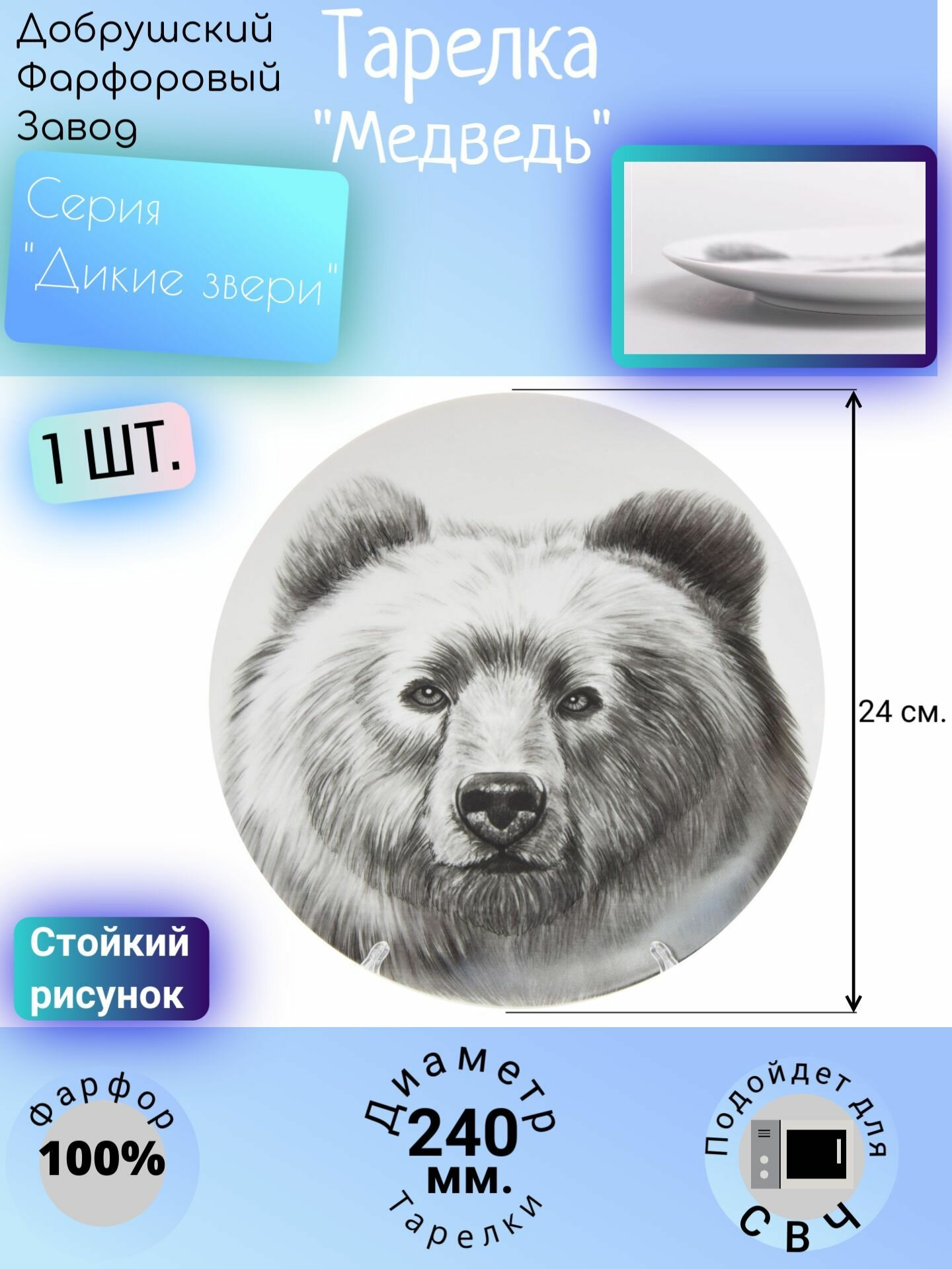 Тарелка блинная плоская, блюдо для пиццы, 240 мм. "Медведь", для СВЧ, Добрушский фарфоровый завод; белый, черный - 1 шт. интересное: