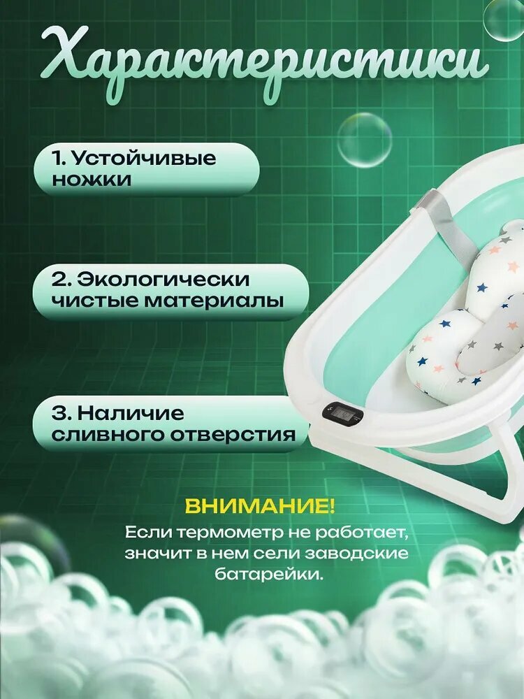Ванночка для купания новорожденных складная с термометром и подушкой 75х46х21 зеленая интересное: