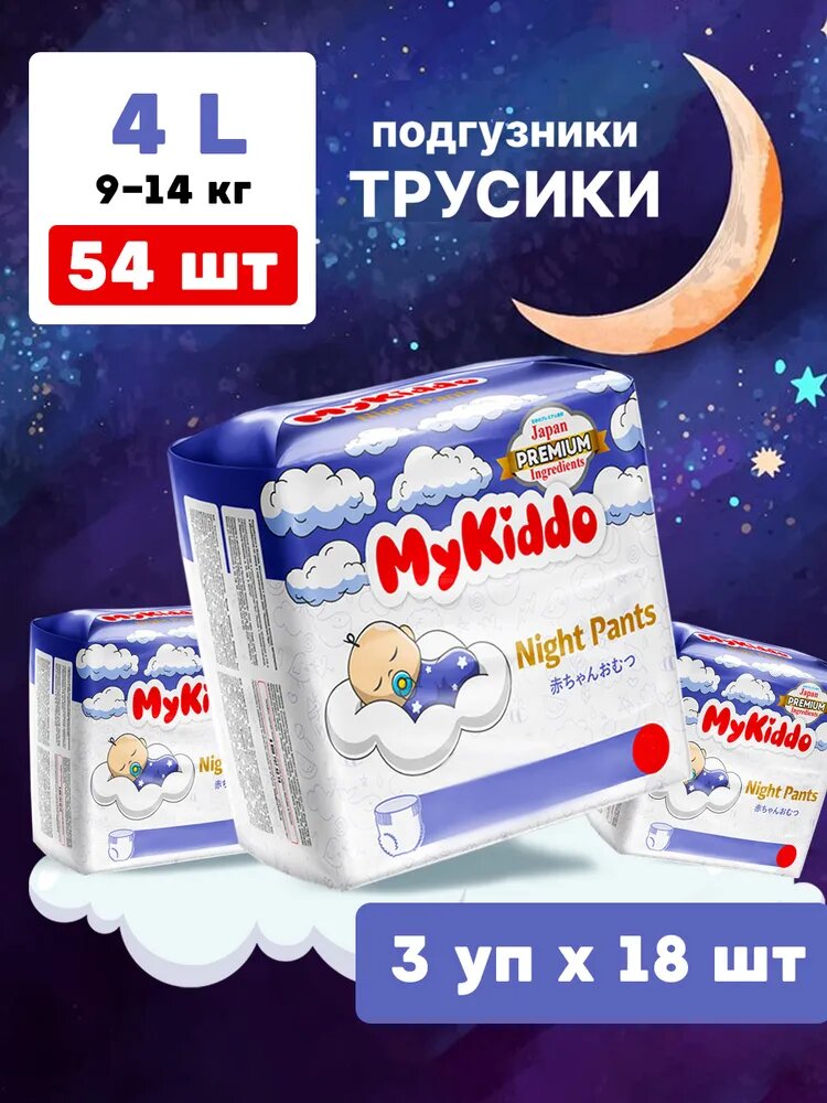 Подгузники трусики 4 L, ночные, для детей 9-14 кг, MyKiddo, Night, мегабокс 54 шт. (3 упаковки по 18 шт.) интересное: