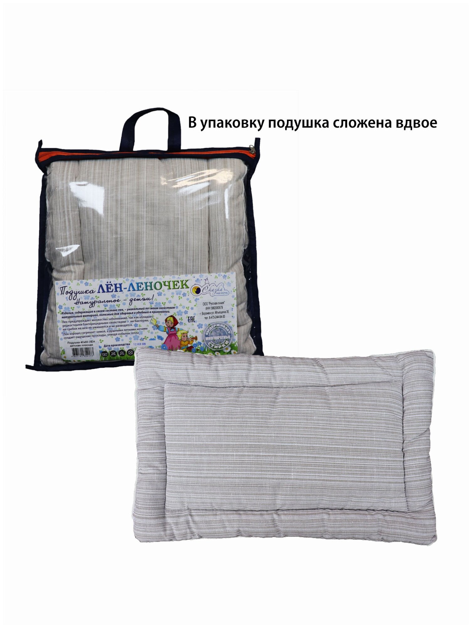 Подушка детская 40х60 см натуральная дышащая льняная (чехол лен+хлопок, внутри льняные волокна) плоская интересное: