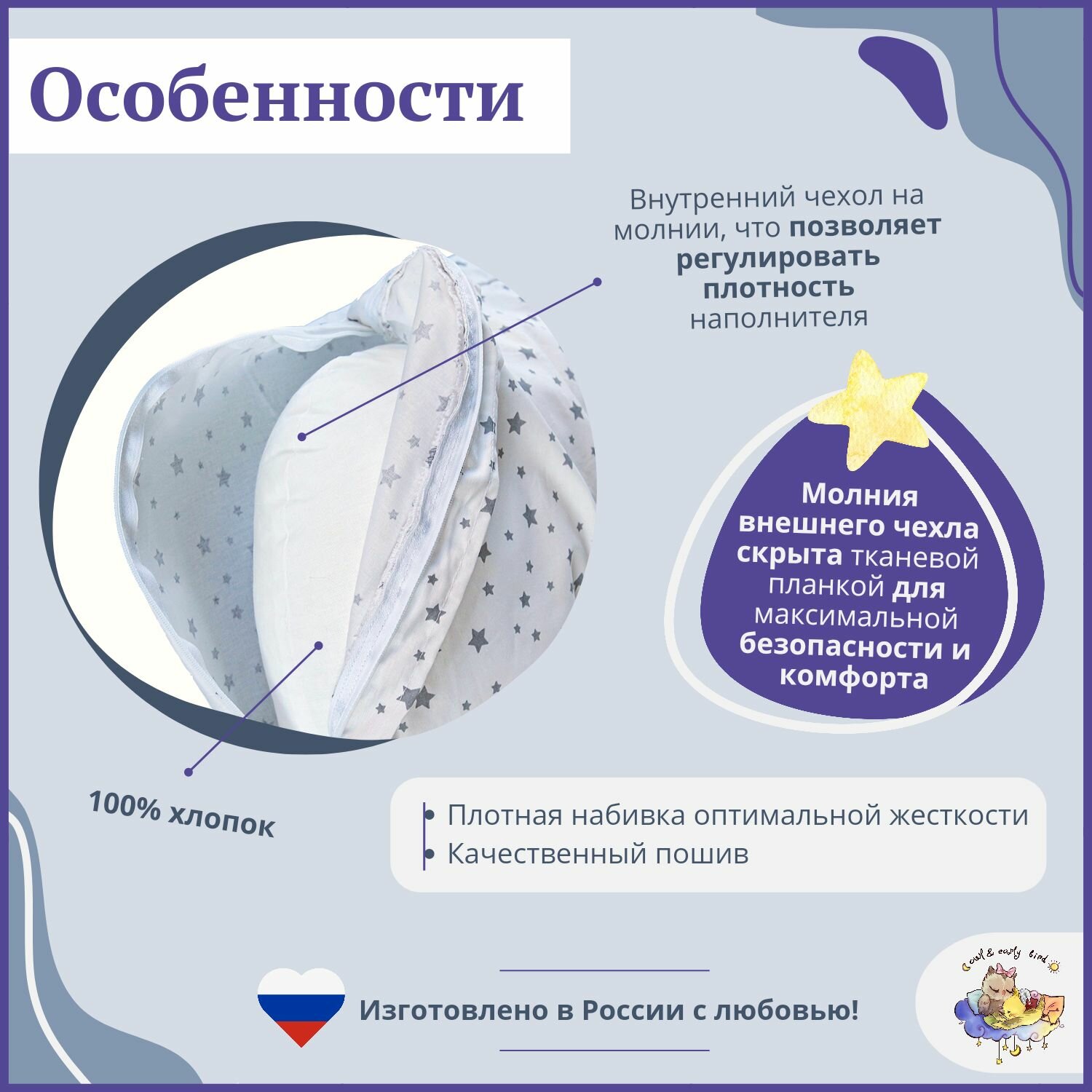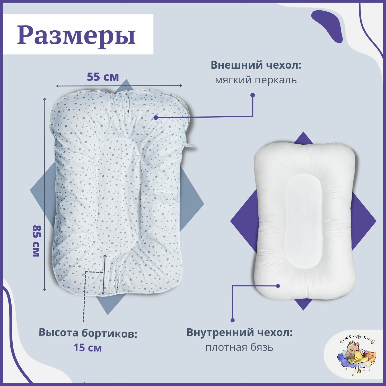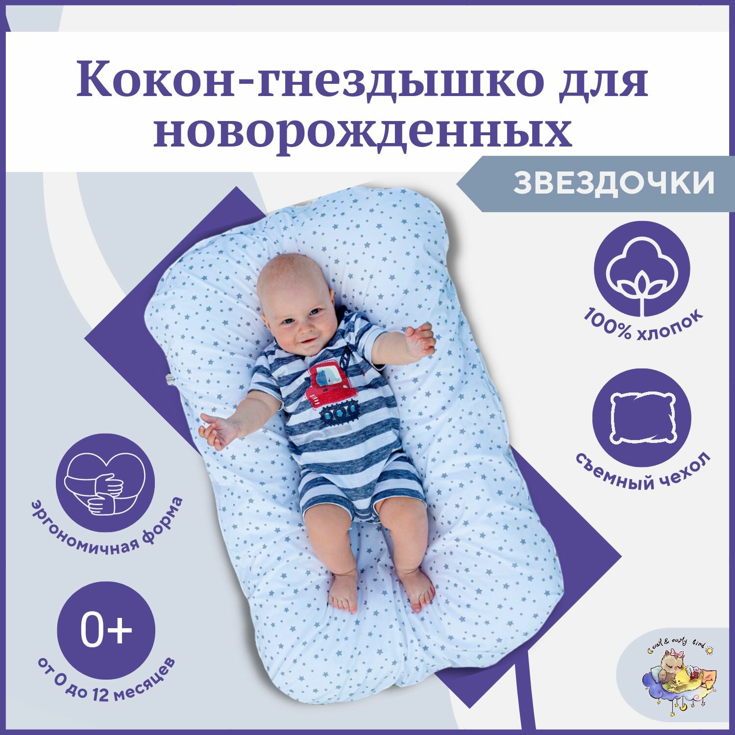 Кокон для новорожденных, позиционер гнездышко для сна малыша Owl&EarlyBird Облачко, Звездочки интересное:
