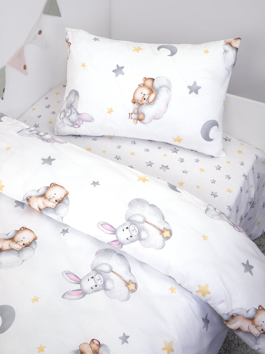 Купить Постельное белье 1 спальное детское 160х80 Поплин Мишки и зайки в облаках