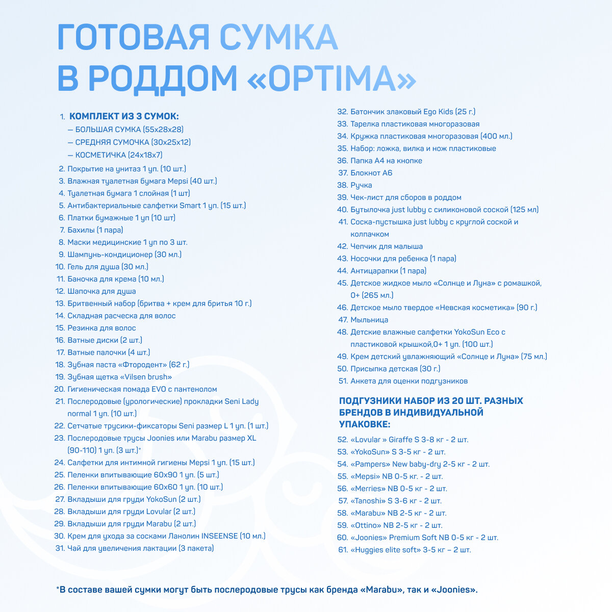 Сумка в роддом готовая для мамы и малыша с наполнением, Lana Optima, 61 предмет, матовая интересное: