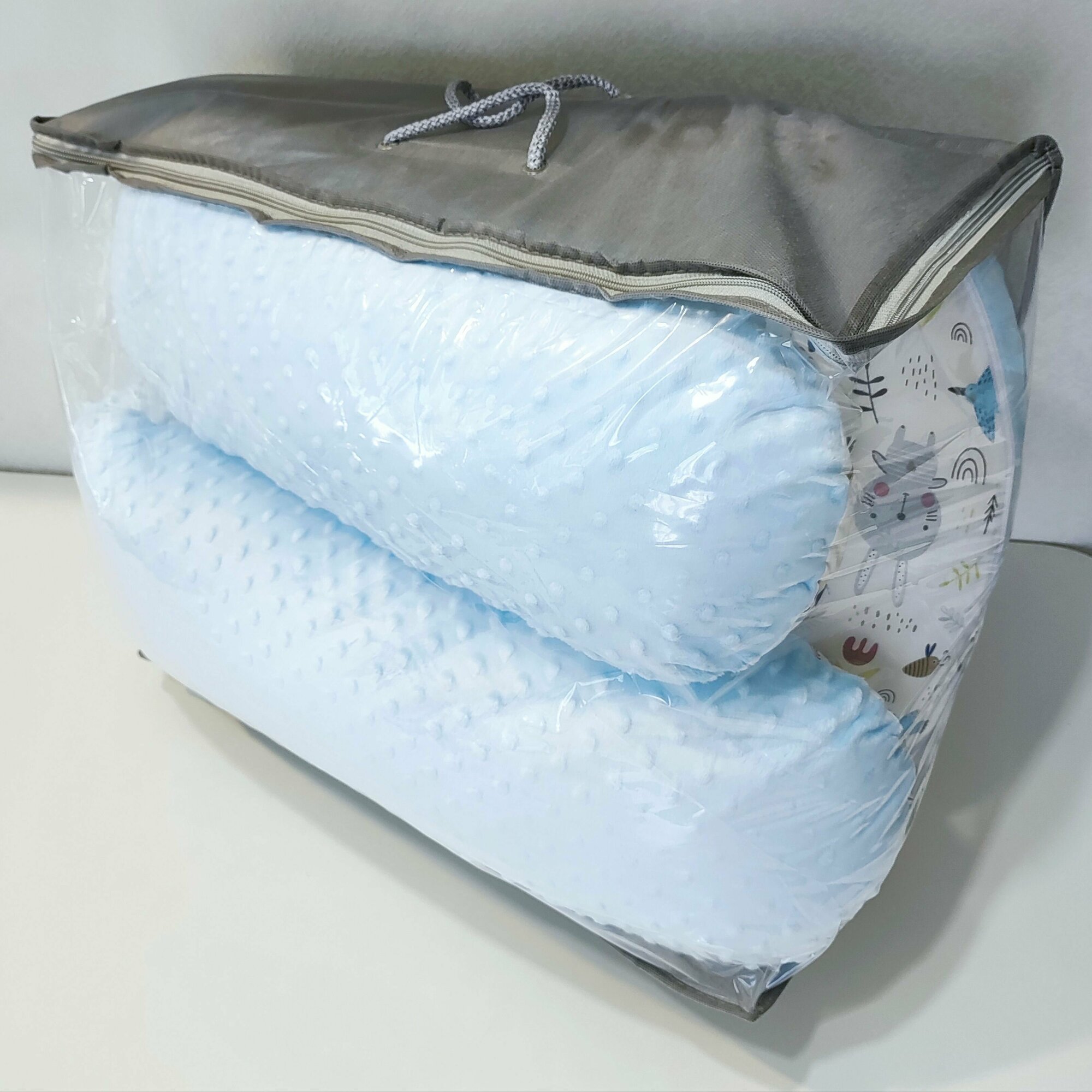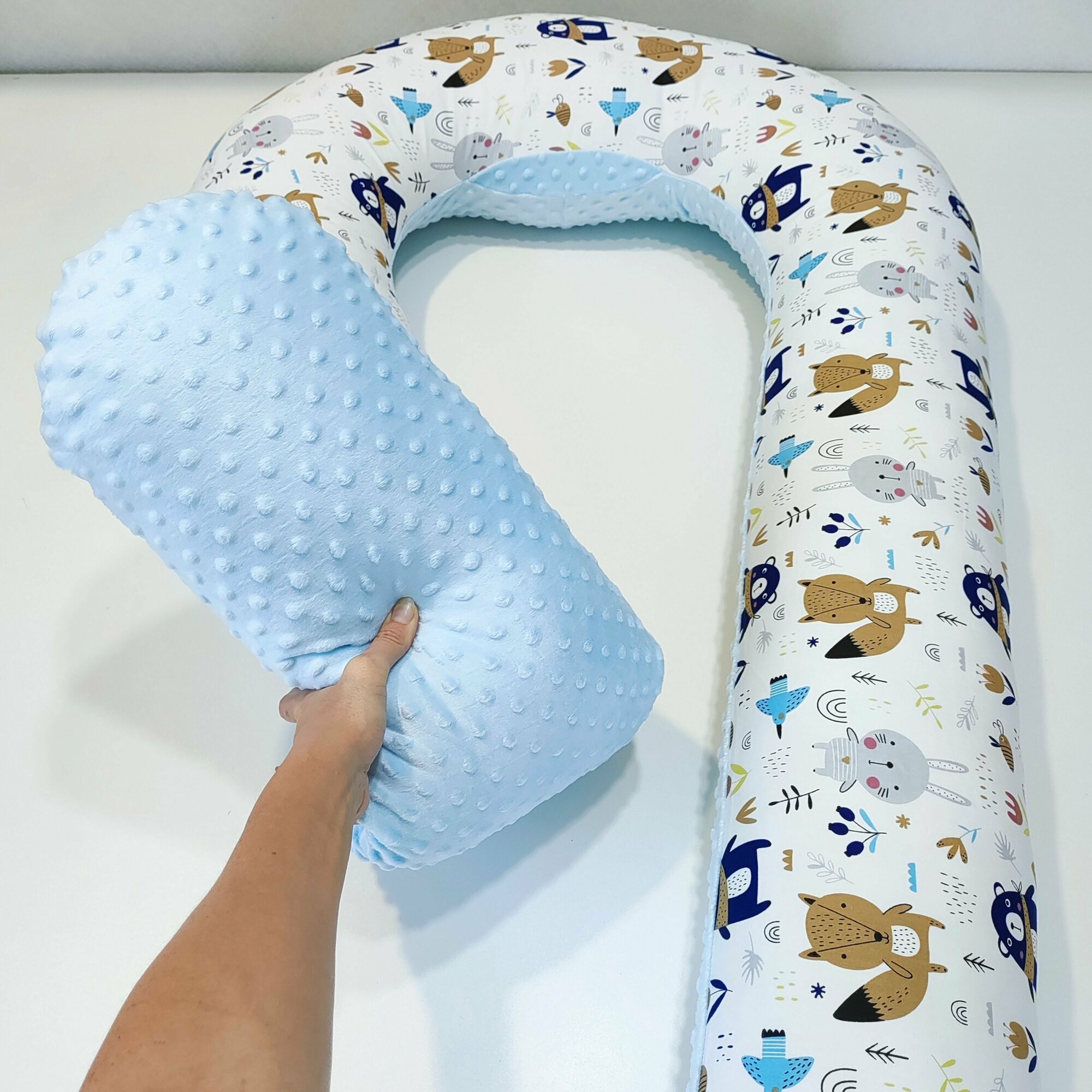 Купить Подушка для беременных с голубым плюшем 360, зверята на белом