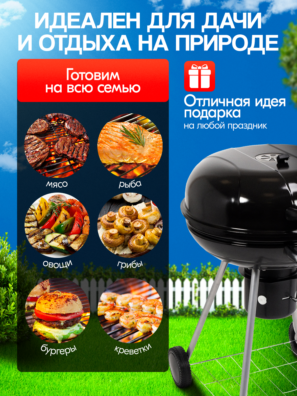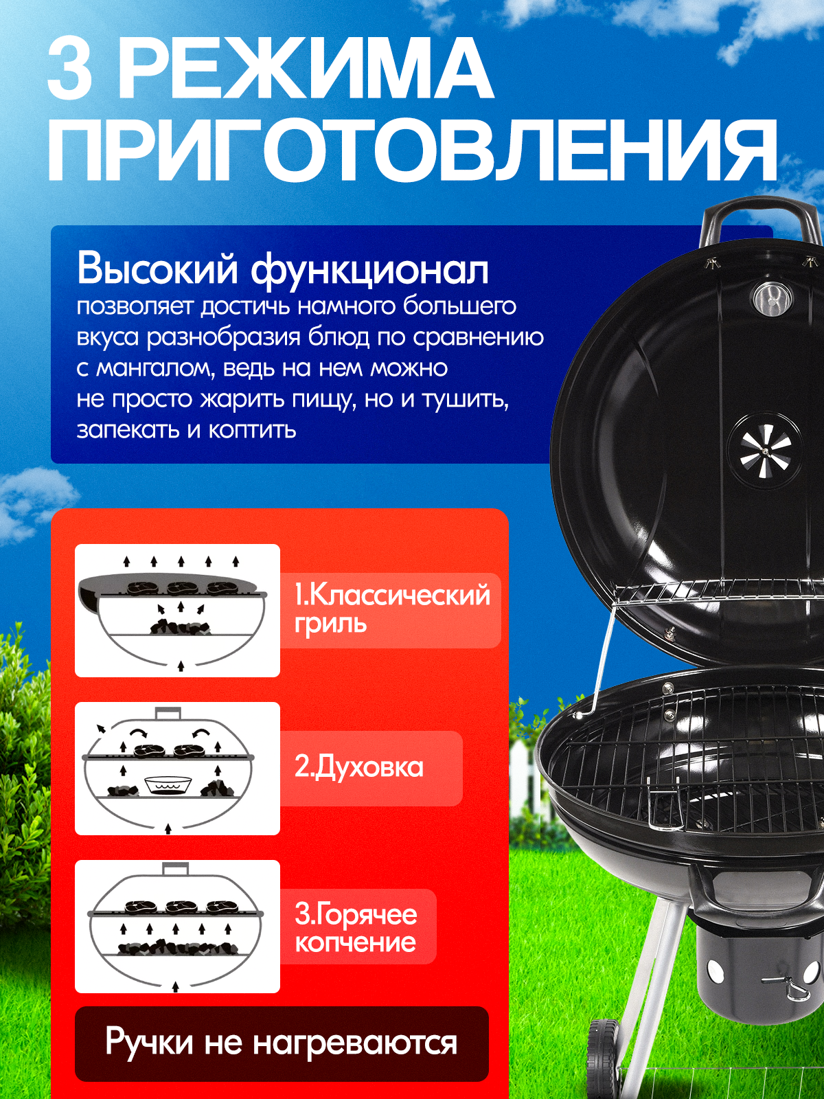 Гриль барбекю, угольный круглый, с колесами, 57 см, из нержавеющей стали интересное: