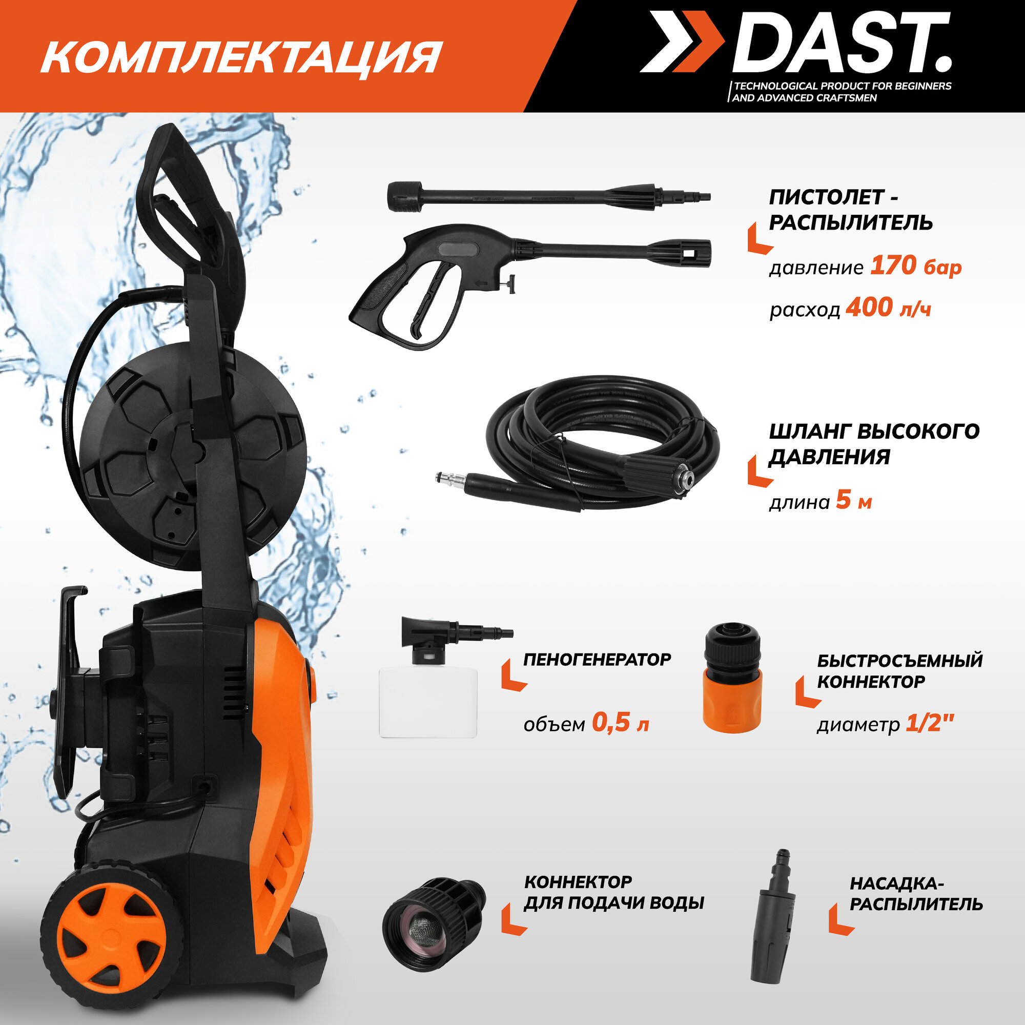 Мойка высокого давления 1800 Вт, 150 бар - 120 бар, 390 л/час, пеногенератор, шланг 5 м, шнур 3 м, DAST DMVD-1800S