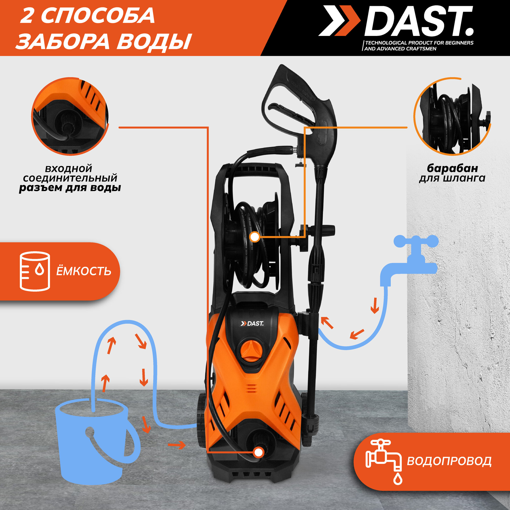 Мойка высокого давления 2600 Вт, 210 бар - 170 бар, 480 л/час, пеногенератор, шланг 8 м, кабель 5 м, DAST DMVD-2600S