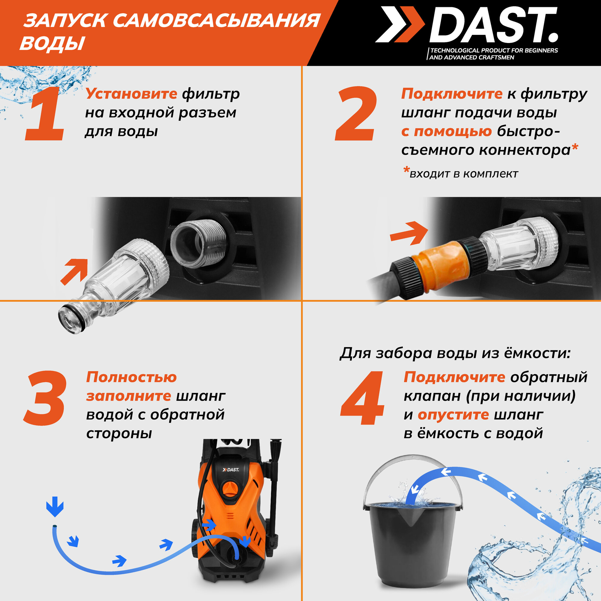 Мойка высокого давления 2500 Вт, 210 бар - 160 бар, 470 л/час, пеногенератор, шланг 8 м, кабель 5 м, DAST DMVD-2500S