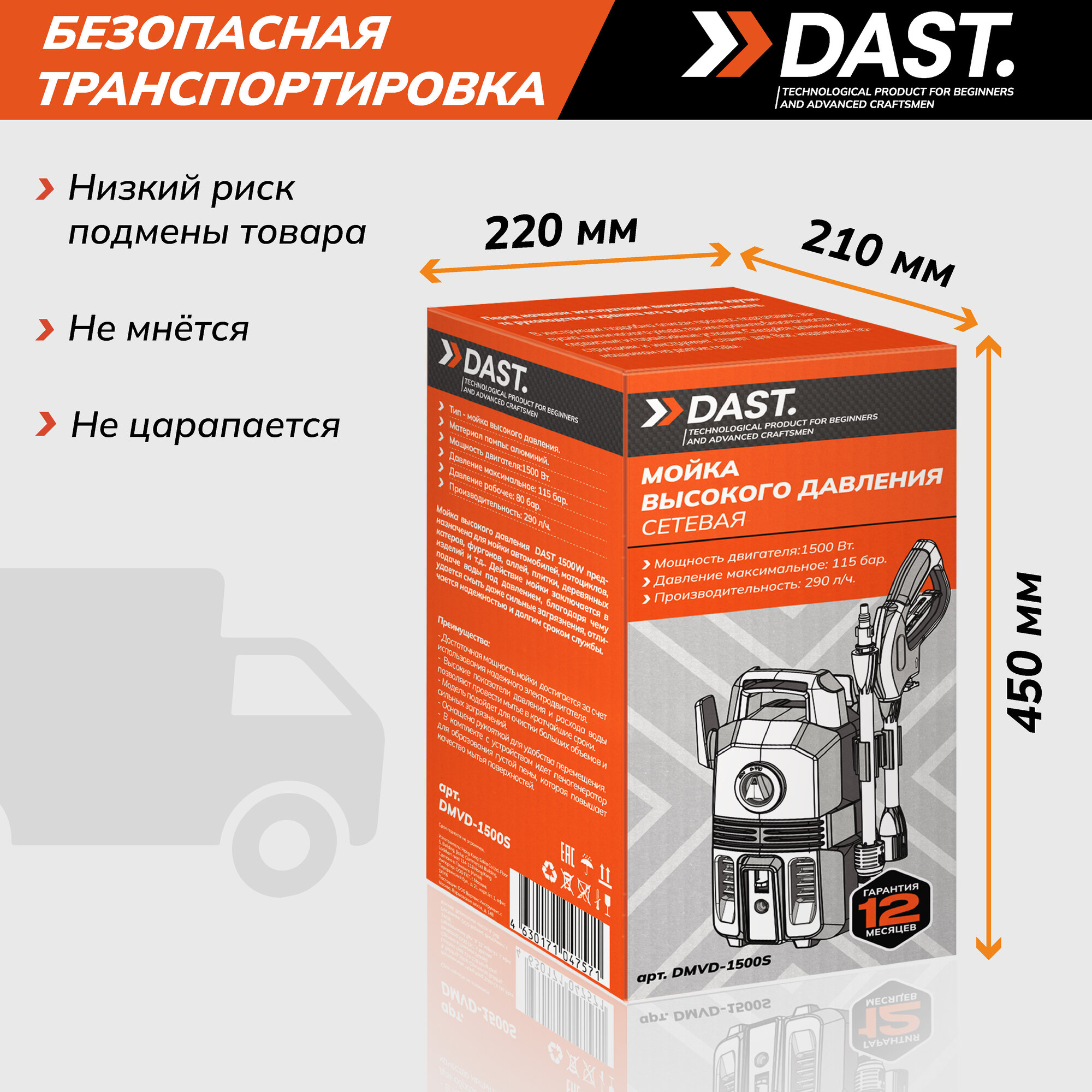 Купить Мойка высокого давления 1500 Вт, 115 бар - 80 бар, 290 л/час, пеногенератор, шланг 5м, шнур 3 м, DAST DMVD-1500S
