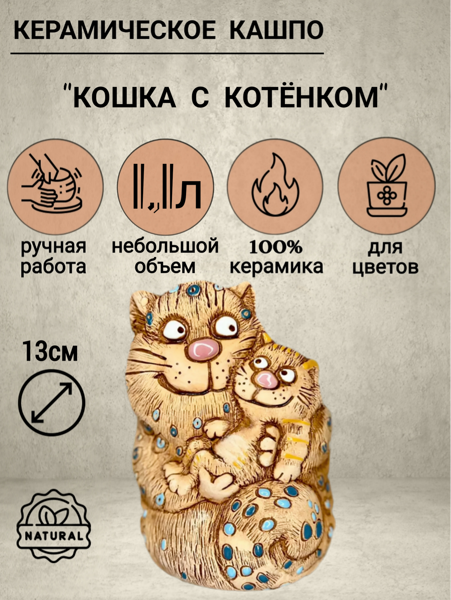 Авторское керамическое кашпо для цветов ручной работы, Кошка с котёнком интересное: