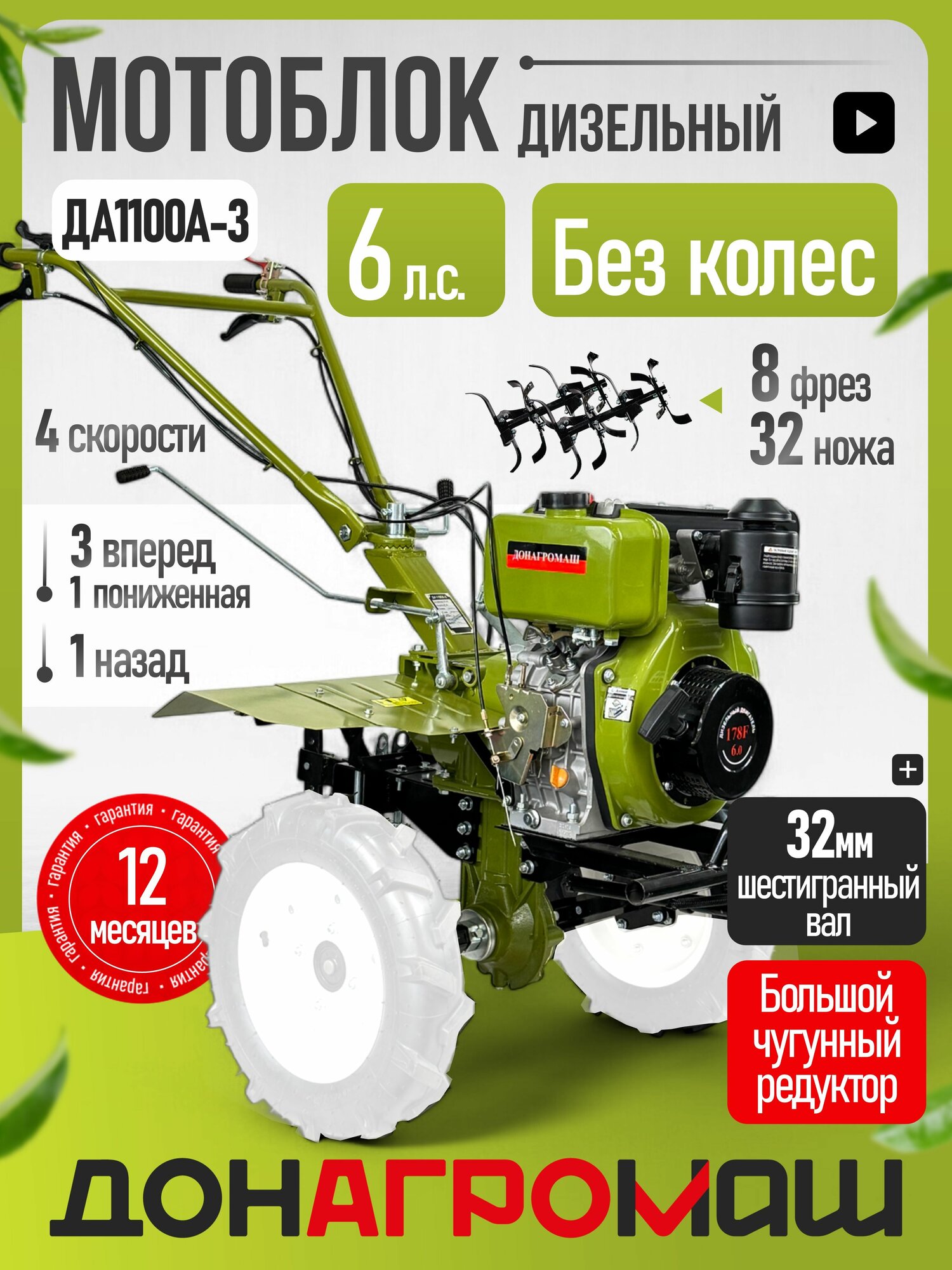 Донагромаш Мотоблок дизельный редукторный ДА1100А-3 (6 л. с, 3 вперед / 1 назад, без колес) интересное: