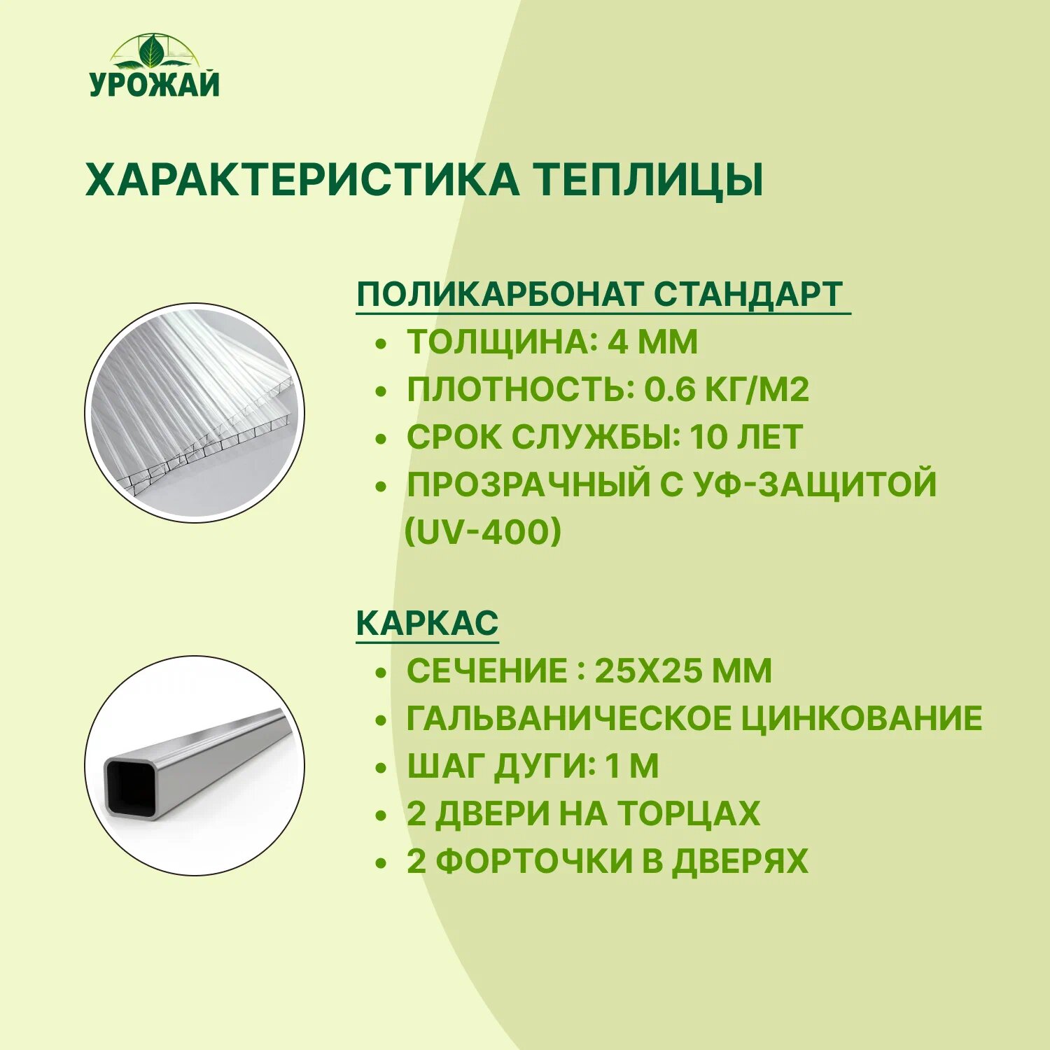 Теплица из поликарбоната Каплевидная 3x4 метра, оцинкованный каркас 25x25, 2 двери и 2 форточки на торцах