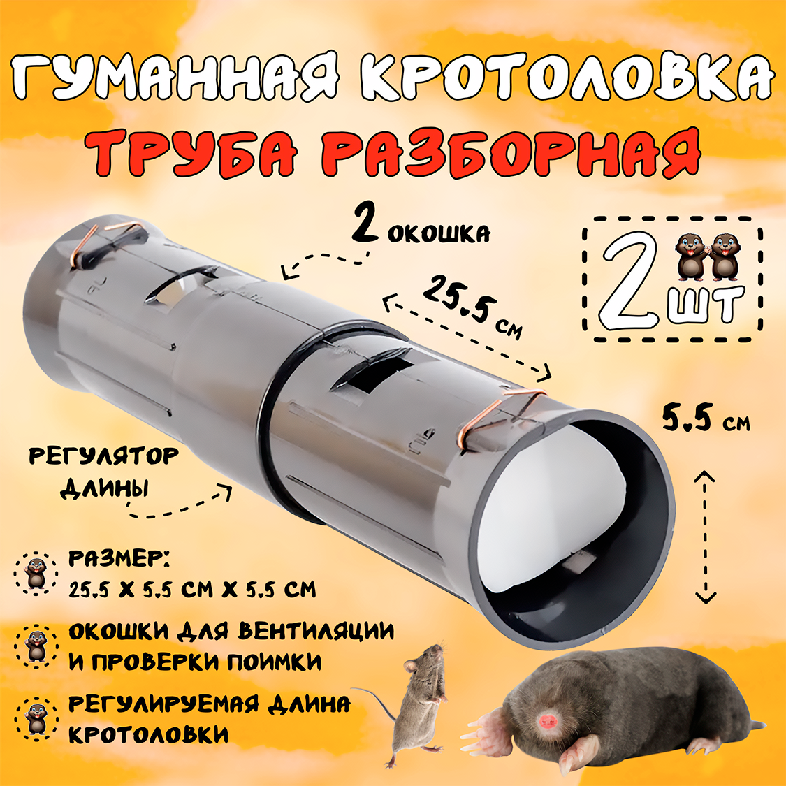 Кротоловка труба гуманная, капкан для кротов, мышей, землероек, Планета Садовод, Черный, 2 штуки интересное: