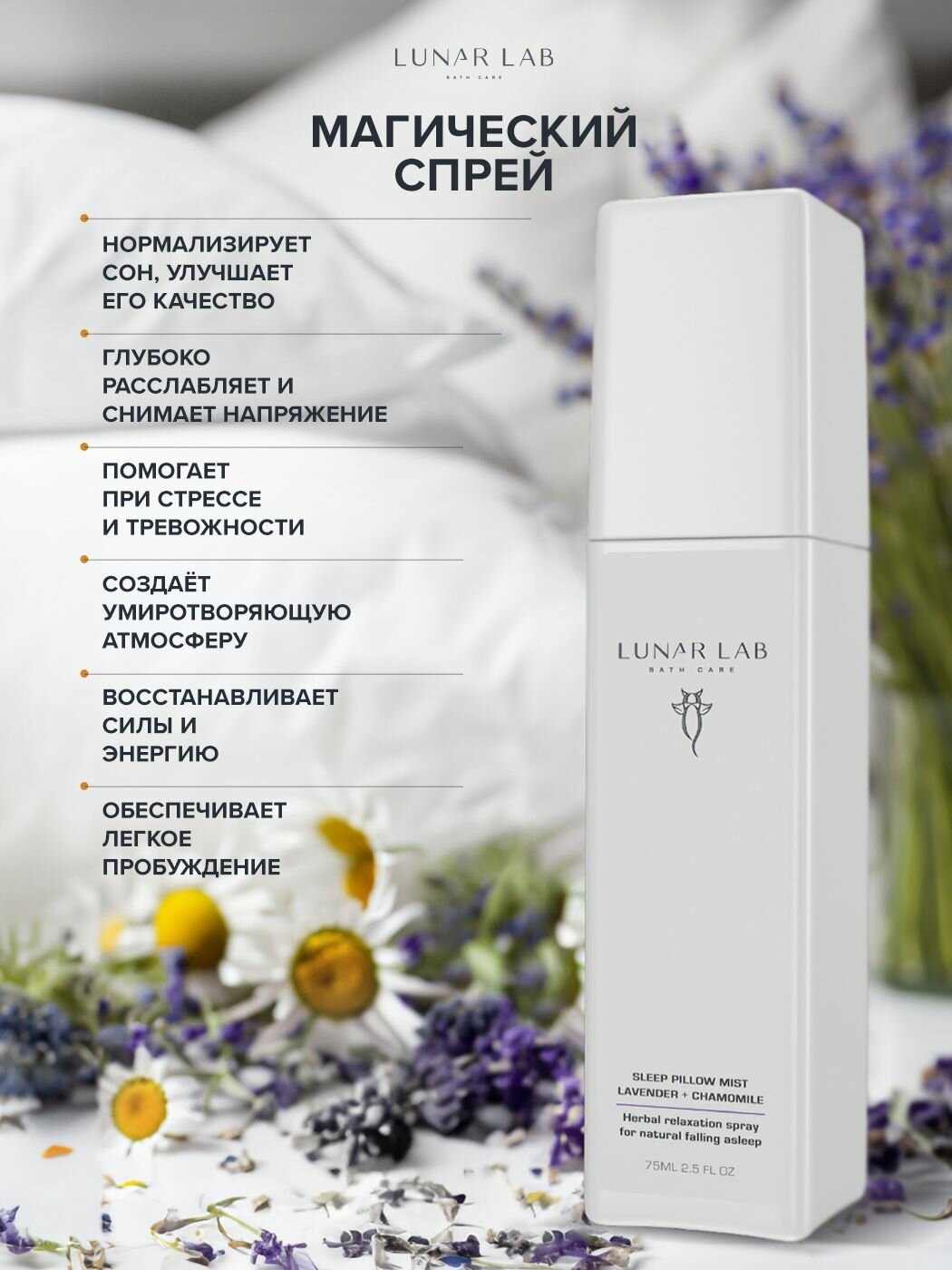 Lunar Lab, Ароматический мист для подушки и постельного белья / спрей расслабляющий для глубокого сна / лаванда, ромашка, ветивер, 75 мл интересное: