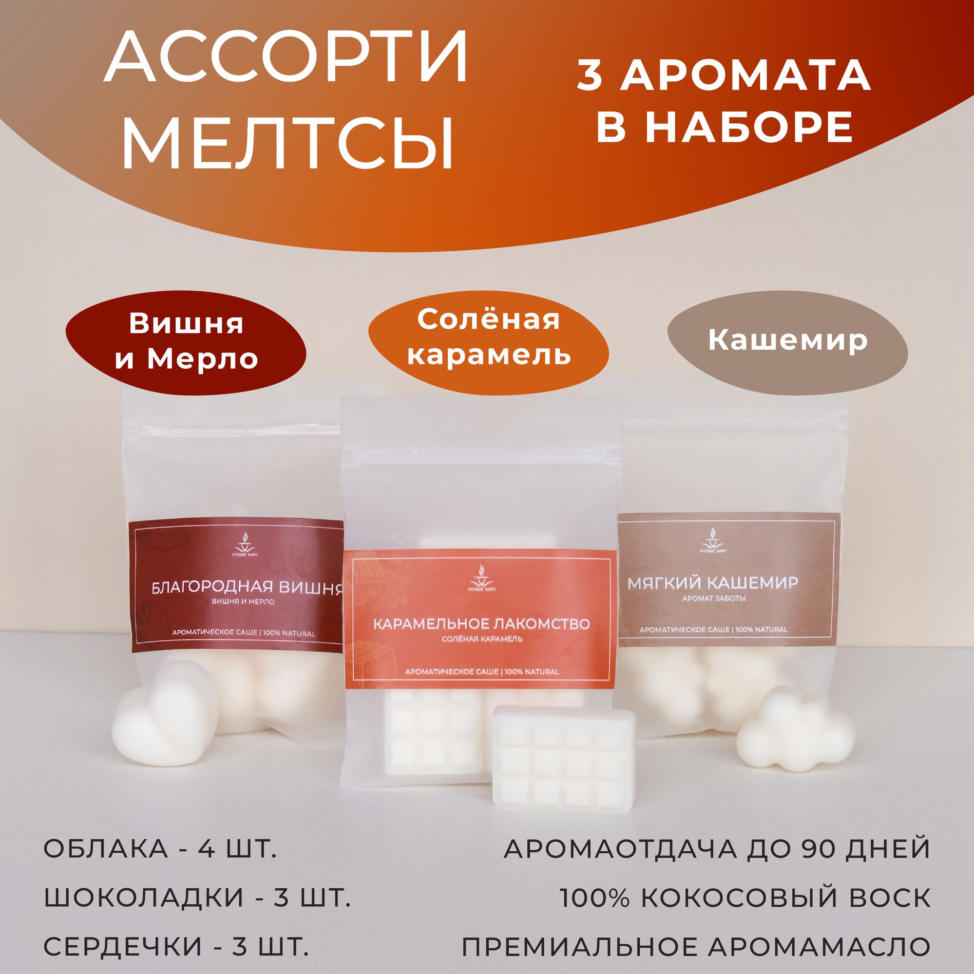 Саше для шкафа и белья ароматическое "Hygge Way". Ароматизатор в шкаф и мелтсы для одежды "Ассорти АСМ 3 в 1"