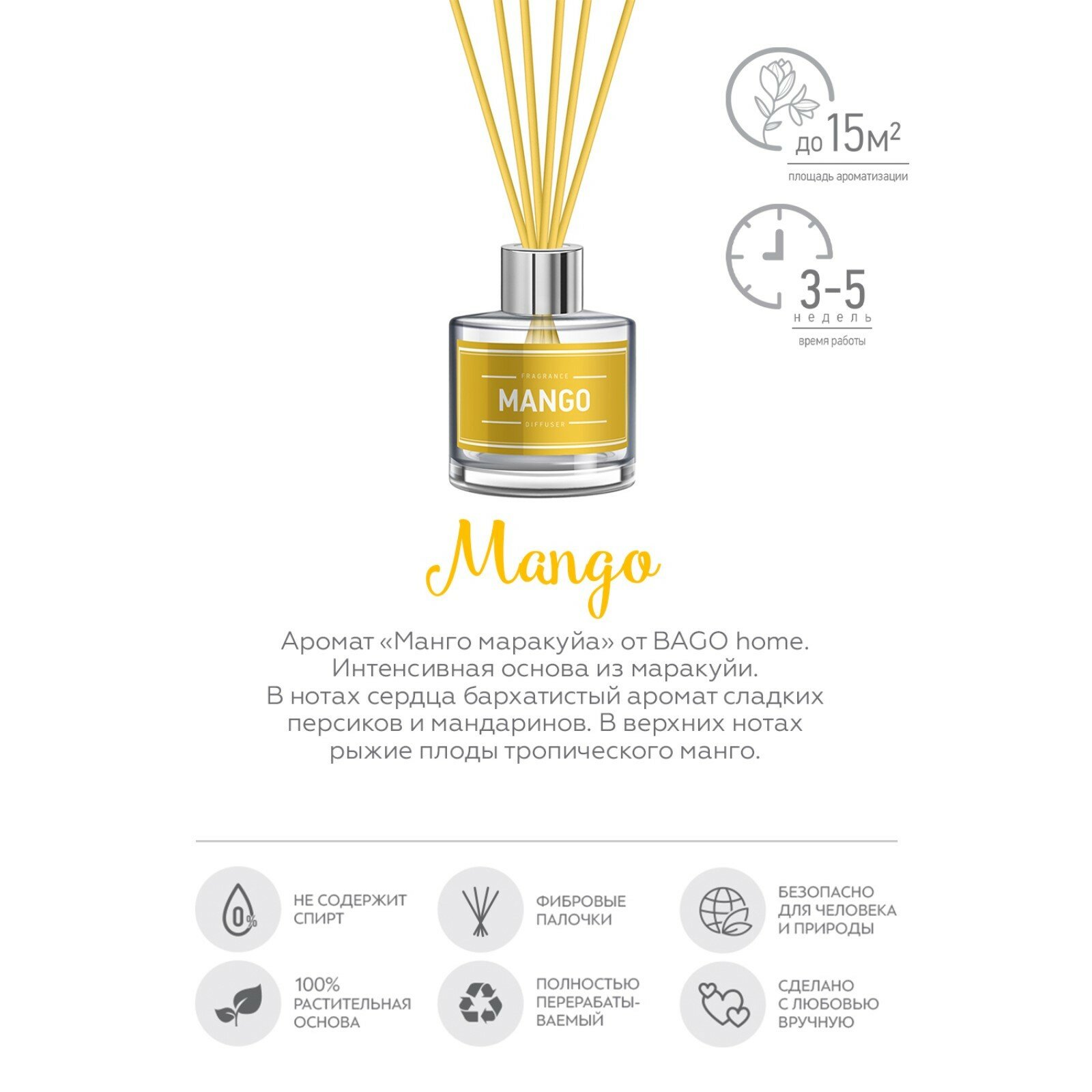 СохранитьДиффузор для дома BAGO home Манго маракуйя 40 мл, без спирта, растительная основа интересное: