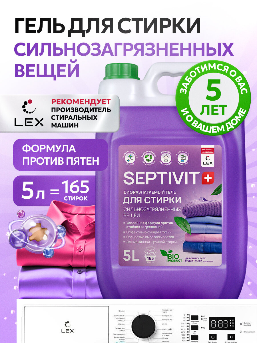 Купить Гель для стирки Septivit, для сильнозагрязненных тканей, канистра, 5 л