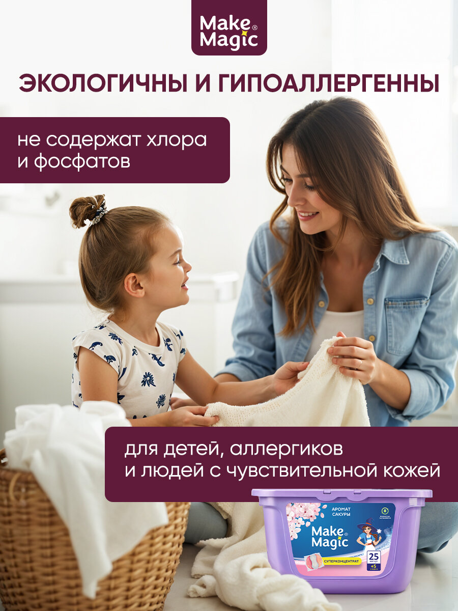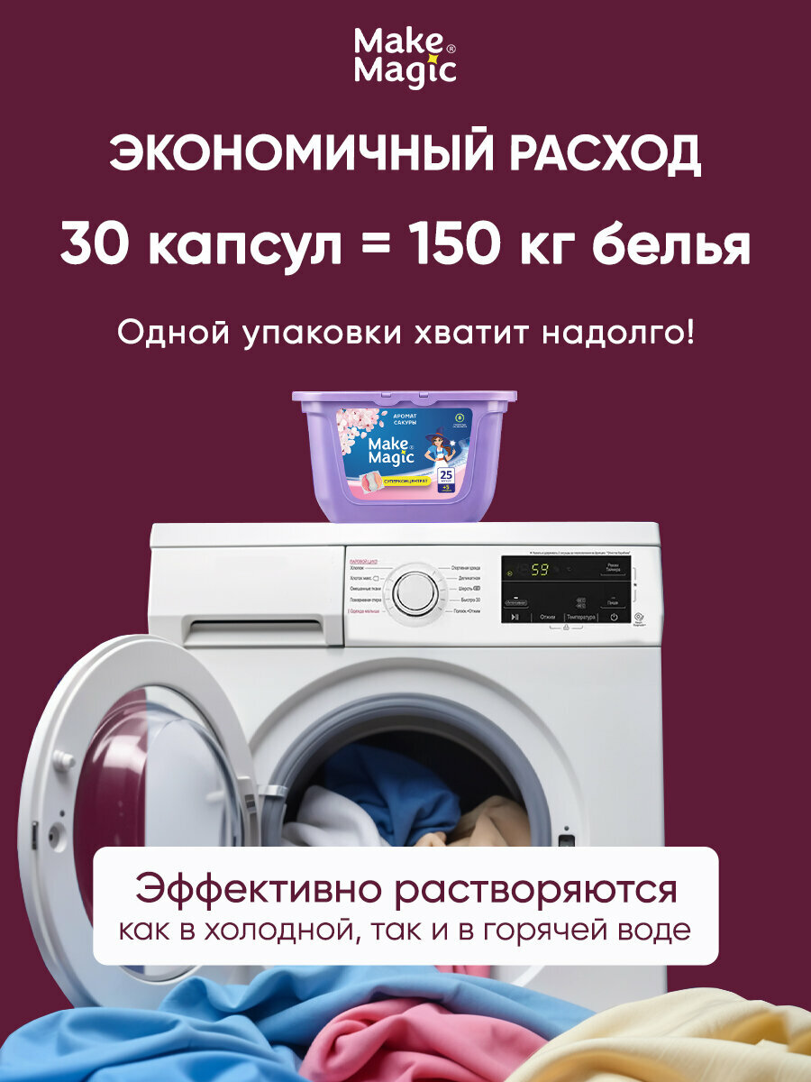 Купить Капсулы для стирки белья Make magic 30 шт универсальные, очищение и ароматизация, удаление пятен и загрязнений, аромат сакуры