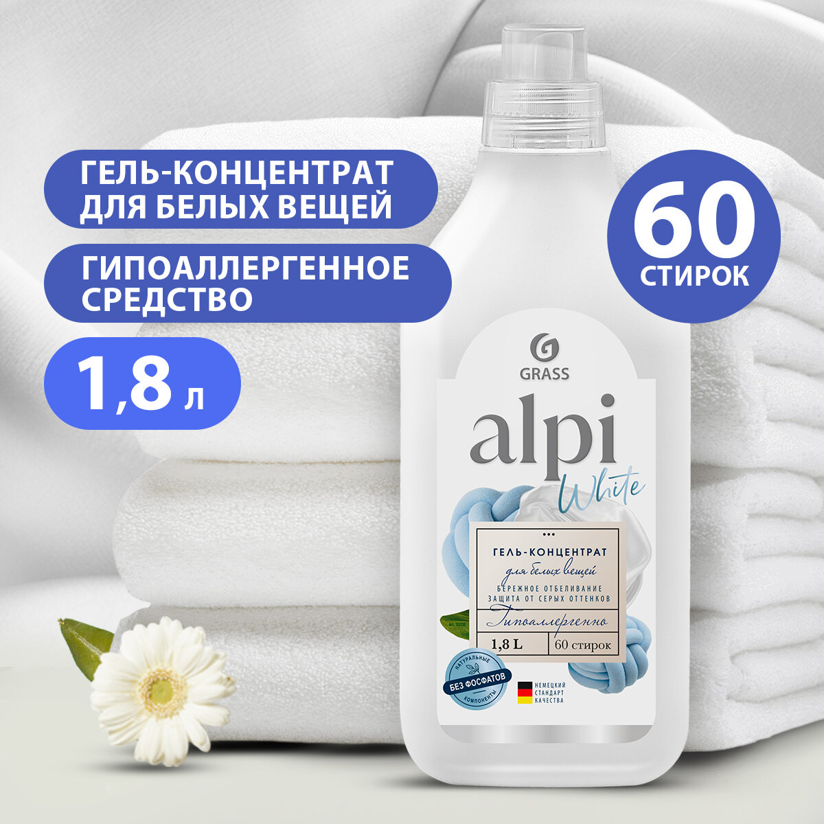 Купить GRASS/ Гель для стирки белой одежды ALPI white gel, бережное отбеливание, гипоаллергенно, концентрат, 60 стирок, 1800 мл.